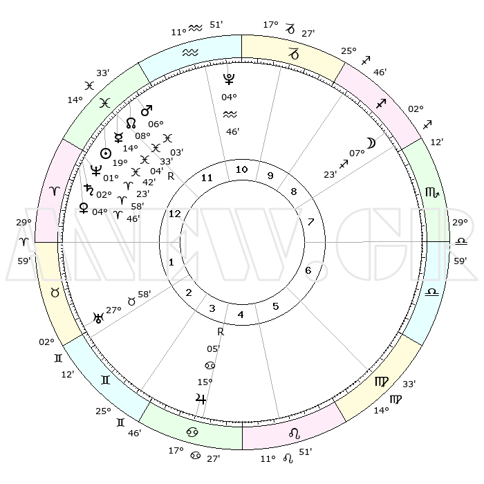 | | ΘΕΣΕΙΣ ΠΛΑΝΗΤΩΝ ΑΣΤΡΟΛΟΓΙΚΟΥ ΧΑΡΤΗ ΤΗΣ ΣΤΙΓΜΗΣ ΑΥΤΗΣ | | | | Πλανήτης | Ζώδιο | Μοίρες | Δεκαήμ. | Σε οίκο | Απόκλιση | | Ακμές των οίκων | | Ηλιος | Ιχθείς | 19°39' | Δεύτερο | 12 | 04 S 06 | | 1ος | 28°08' | Ιχθείς | | Σελήνη | Τοξότης | 06°44' | Πρώτο | 9 | 26 S 37 | | 2ος | 08°52' | Ταύρος | | Ερμής | Ιχθείς | 14°07'R | Δεύτερο | 12 | 03 S 09 | | 3ος | 06°34' | Δίδυμοι | | Αφροδίτη | Κριός | 04°42' | Πρώτο | 1 | 00 N 47 | | 4ος | 28°57' | Δίδυμοι | | Αρης | Ιχθείς | 06°01' | Πρώτο | 12 | 10 S 19 | | 5ος | 21°11' | Καρκίνος | | Δίας | Καρκίνος | 15°05'R | Δεύτερο | 4 | 22 N 56 | | 6ος | 18°18' | Λέων | | Κρόνος | Κριός | 02°57' | Πρώτο | 1 | 00 S 47 | | 7ος | 28°08' | Παρθένος | | Ουρανός | Ταύρος | 27°58' | Τρίτο | 2 | 19 N 32 | | 8ος | 08°52' | Σκορπιός | | Ποσειδώνας | Κριός | 01°23' | Πρώτο | 1 | 00 S 39 | | 9ος | 06°34' | Τοξότης | | Πλούτωνας | Υδροχόος | 04°46' | Πρώτο | 11 | 22 S 50 | | 10ος | 28°57' | Τοξότης | | Β. Δεσμός | Ιχθείς | 08°33' | Πρώτο | 12 | 08 S 22 | | 11ος | 21°11' | Αιγόκερως | | Ωροσκόπος | Ιχθείς | 28°08' | Τρίτο | | | 12ος | 18°18' | Υδροχόος | | Μεσουράνημα | Τοξότης | 28°57' | Τρίτο | | | |