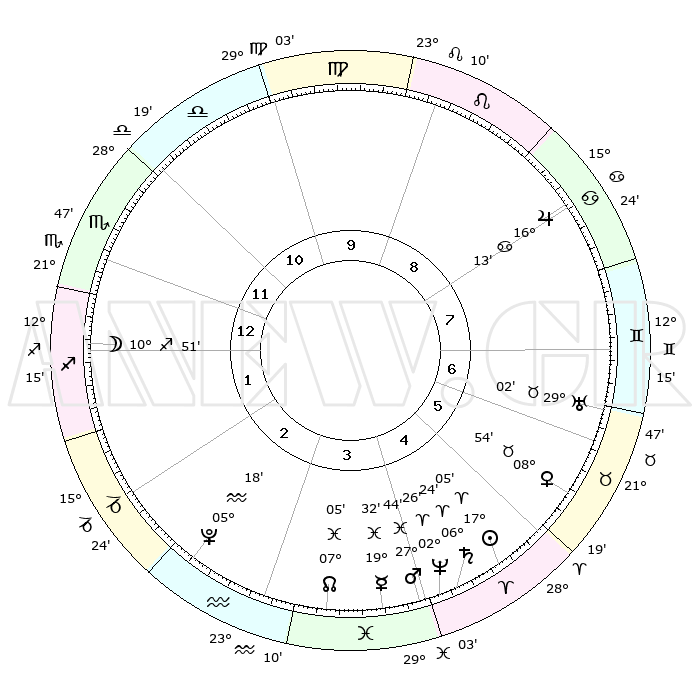 | | ΘΕΣΕΙΣ ΠΛΑΝΗΤΩΝ ΑΣΤΡΟΛΟΓΙΚΟΥ ΧΑΡΤΗ ΤΗΣ ΣΤΙΓΜΗΣ ΑΥΤΗΣ | | | | Πλανήτης | Ζώδιο | Μοίρες | Δεκαήμ. | Σε οίκο | Απόκλιση | | Ακμές των οίκων | | Ηλιος | Κριός | 17°01' | Δεύτερο | 5 | 06 N 41 | | 1ος | 23°38' | Σκορπιός | | Σελήνη | Τοξότης | 10°06' | Δεύτερο | 1 | 27 S 04 | | 2ος | 23°58' | Τοξότης | | Ερμής | Ιχθείς | 19°28' | Δεύτερο | 4 | 06 S 04 | | 3ος | 28°39' | Αιγόκερως | | Αφροδίτη | Ταύρος | 08°49' | Πρώτο | 6 | 14 N 15 | | 4ος | 04°27' | Ιχθείς | | Αρης | Ιχθείς | 27°41' | Τρίτο | 4 | 01 S 52 | | 5ος | 06°12' | Κριός | | Δίας | Καρκίνος | 16°13' | Δεύτερο | 8 | 22 N 49 | | 6ος | 02°07' | Ταύρος | | Κρόνος | Κριός | 06°23' | Πρώτο | 5 | 00 N 34 | | 7ος | 23°38' | Ταύρος | | Ουρανός | Ταύρος | 29°02' | Τρίτο | 7 | 19 N 46 | | 8ος | 23°58' | Δίδυμοι | | Ποσειδώνας | Κριός | 02°26' | Πρώτο | 4 | 00 S 14 | | 9ος | 28°39' | Καρκίνος | | Πλούτωνας | Υδροχόος | 05°18' | Πρώτο | 3 | 22 S 47 | | 10ος | 04°27' | Παρθένος | | Β. Δεσμός | Ιχθείς | 07°06' | Πρώτο | 4 | 08 S 54 | | 11ος | 06°12' | Ζυγός | | Ωροσκόπος | Σκορπιός | 23°38' | Τρίτο | | | 12ος | 02°07' | Σκορπιός | | Μεσουράνημα | Παρθένος | 04°27' | Πρώτο | | | |