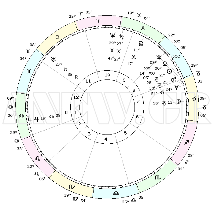 | | ΘΕΣΕΙΣ ΠΛΑΝΗΤΩΝ ΑΣΤΡΟΛΟΓΙΚΟΥ ΧΑΡΤΗ ΤΗΣ ΣΤΙΓΜΗΣ ΑΥΤΗΣ | | | | Πλανήτης | Ζώδιο | Μοίρες | Δεκαήμ. | Σε οίκο | Απόκλιση | | Ακμές των οίκων | | Ηλιος | Αιγόκερως | 27°40' | Τρίτο | 5 | 20 S 37 | | 1ος | 05°54' | Παρθένος | | Σελήνη | Αιγόκερως | 15°41' | Δεύτερο | 5 | 26 S 38 | | 2ος | 00°22' | Ζυγός | | Ερμής | Αιγόκερως | 25°11' | Τρίτο | 5 | 22 S 59 | | 3ος | 29°32' | Ζυγός | | Αφροδίτη | Υδροχόος | 00°19' | Πρώτο | 5 | 21 S 07 | | 4ος | 02°29' | Τοξότης | | Αρης | Αιγόκερως | 25°39' | Τρίτο | 5 | 21 S 59 | | 5ος | 06°18' | Αιγόκερως | | Δίας | Καρκίνος | 19°07'R | Δεύτερο | 11 | 22 N 21 | | 6ος | 07°50' | Υδροχόος | | Κρόνος | Ιχθείς | 27°28' | Τρίτο | 7 | 03 S 02 | | 7ος | 05°54' | Ιχθείς | | Ουρανός | Ταύρος | 27°35'R | Τρίτο | 9 | 19 N 26 | | 8ος | 00°22' | Κριός | | Ποσειδώνας | Ιχθείς | 29°48' | Τρίτο | 7 | 01 S 18 | | 9ος | 29°31' | Κριός | | Πλούτωνας | Υδροχόος | 03°15' | Πρώτο | 5 | 23 S 07 | | 10ος | 02°29' | Δίδυμοι | | Β. Δεσμός | Ιχθείς | 11°17' | Δεύτερο | 7 | 07 S 20 | | 11ος | 06°18' | Καρκίνος | | Ωροσκόπος | Παρθένος | 05°54' | Πρώτο | | | 12ος | 07°50' | Λέων | | Μεσουράνημα | Δίδυμοι | 02°29' | Πρώτο | | | |