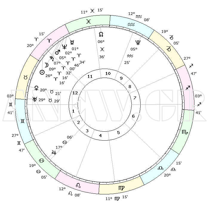 | | ΘΕΣΕΙΣ ΠΛΑΝΗΤΩΝ ΑΣΤΡΟΛΟΓΙΚΟΥ ΧΑΡΤΗ ΤΗΣ ΣΤΙΓΜΗΣ ΑΥΤΗΣ | | | | Πλανήτης | Ζώδιο | Μοίρες | Δεκαήμ. | Σε οίκο | Απόκλιση | | Ακμές των οίκων | | Ηλιος | Κριός | 26°12' | Τρίτο | 12 | 10 N 07 | | 1ος | 05°40' | Ταύρος | | Σελήνη | Κριός | 08°24' | Πρώτο | 12 | 05 N 43 | | 2ος | 06°20' | Δίδυμοι | | Ερμής | Κριός | 01°29' | Πρώτο | 12 | 01 S 49 | | 3ος | 29°21' | Δίδυμοι | | Αφροδίτη | Ταύρος | 20°16' | Τρίτο | 1 | 18 N 02 | | 4ος | 21°05' | Καρκίνος | | Αρης | Κριός | 04°57' | Πρώτο | 12 | 01 N 04 | | 5ος | 16°05' | Λέων | | Δίας | Καρκίνος | 17°05' | Δεύτερο | 3 | 22 N 43 | | 6ος | 19°56' | Παρθένος | | Κρόνος | Κριός | 07°32' | Πρώτο | 12 | 01 N 01 | | 7ος | 05°40' | Σκορπιός | | Ουρανός | Ταύρος | 29°29' | Τρίτο | 1 | 19 N 52 | | 8ος | 06°20' | Τοξότης | | Ποσειδώνας | Κριός | 02°46' | Πρώτο | 12 | 00 S 06 | | 9ος | 29°21' | Τοξότης | | Πλούτωνας | Υδροχόος | 05°25' | Πρώτο | 10 | 22 S 47 | | 10ος | 21°05' | Αιγόκερως | | Β. Δεσμός | Ιχθείς | 06°36' | Πρώτο | 11 | 09 S 05 | | 11ος | 16°05' | Υδροχόος | | Ωροσκόπος | Ταύρος | 05°40' | Πρώτο | | | 12ος | 19°56' | Ιχθείς | | Μεσουράνημα | Αιγόκερως | 21°05' | Τρίτο | | | |