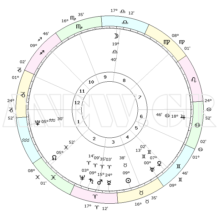 | | ΘΕΣΕΙΣ ΠΛΑΝΗΤΩΝ ΑΣΤΡΟΛΟΓΙΚΟΥ ΧΑΡΤΗ ΤΗΣ ΣΤΙΓΜΗΣ ΑΥΤΗΣ | | | | Πλανήτης | Ζώδιο | Μοίρες | Δεκαήμ. | Σε οίκο | Απόκλιση | | Ακμές των οίκων | | Ηλιος | Ταύρος | 08°09' | Πρώτο | 10 | 14 N 13 | | 1ος | 13°57' | Λέων | | Σελήνη | Ζυγός | 00°36' | Πρώτο | 2 | 02 S 05 | | 2ος | 06°09' | Παρθένος | | Ερμής | Κριός | 21°17' | Τρίτο | 9 | 06 N 17 | | 3ος | 03°03' | Ζυγός | | Αφροδίτη | Δίδυμοι | 05°11' | Πρώτο | 10 | 21 N 56 | | 4ος | 05°24' | Σκορπιός | | Αρης | Κριός | 14°24' | Δεύτερο | 9 | 04 N 51 | | 5ος | 10°45' | Τοξότης | | Δίας | Καρκίνος | 18°34' | Δεύτερο | 12 | 22 N 32 | | 6ος | 14°22' | Αιγόκερως | | Κρόνος | Κριός | 08°58' | Πρώτο | 9 | 01 N 34 | | 7ος | 13°57' | Υδροχόος | | Ουρανός | Δίδυμοι | 00°08' | Πρώτο | 10 | 20 N 01 | | 8ος | 06°09' | Ιχθείς | | Ποσειδώνας | Κριός | 03°11' | Πρώτο | 9 | 00 N 03 | | 9ος | 03°03' | Κριός | | Πλούτωνας | Υδροχόος | 05°30' | Πρώτο | 6 | 22 S 48 | | 10ος | 05°24' | Ταύρος | | Β. Δεσμός | Ιχθείς | 05°57' | Πρώτο | 7 | 09 S 20 | | 11ος | 10°45' | Δίδυμοι | | Ωροσκόπος | Λέων | 13°57' | Δεύτερο | | | 12ος | 14°22' | Καρκίνος | | Μεσουράνημα | Ταύρος | 05°24' | Πρώτο | | | |