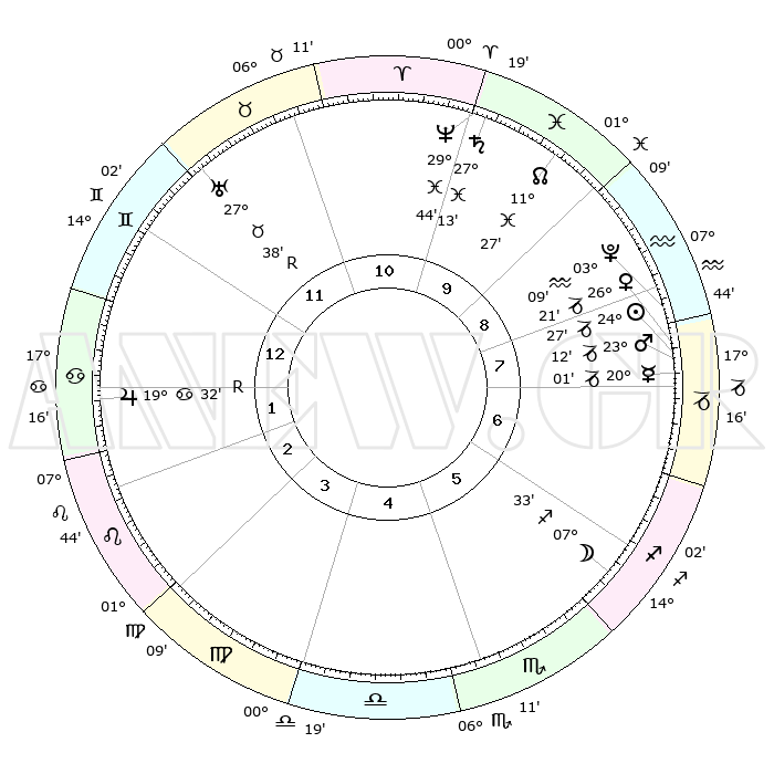 | | ΘΕΣΕΙΣ ΠΛΑΝΗΤΩΝ ΑΣΤΡΟΛΟΓΙΚΟΥ ΧΑΡΤΗ ΤΗΣ ΣΤΙΓΜΗΣ ΑΥΤΗΣ | | | | Πλανήτης | Ζώδιο | Μοίρες | Δεκαήμ. | Σε οίκο | Απόκλιση | | Ακμές των οίκων | | Ηλιος | Αιγόκερως | 24°06' | Τρίτο | 12 | 21 S 17 | | 1ος | 07°09' | Υδροχόος | | Σελήνη | Τοξότης | 03°24' | Πρώτο | 10 | 25 S 49 | | 2ος | 22°14' | Ιχθείς | | Ερμής | Αιγόκερως | 19°28' | Δεύτερο | 12 | 23 S 45 | | 3ος | 29°27' | Κριός | | Αφροδίτη | Αιγόκερως | 25°55' | Τρίτο | 12 | 21 S 54 | | 4ος | 26°45' | Ταύρος | | Αρης | Αιγόκερως | 22°55' | Τρίτο | 12 | 22 S 26 | | 5ος | 19°03' | Δίδυμοι | | Δίας | Καρκίνος | 19°35'R | Δεύτερο | 6 | 22 N 16 | | 6ος | 10°48' | Καρκίνος | | Κρόνος | Ιχθείς | 27°11' | Τρίτο | 2 | 03 S 09 | | 7ος | 07°09' | Λέων | | Ουρανός | Ταύρος | 27°39'R | Τρίτο | 4 | 19 N 26 | | 8ος | 22°14' | Παρθένος | | Ποσειδώνας | Ιχθείς | 29°43' | Τρίτο | 2 | 01 S 20 | | 9ος | 29°27' | Ζυγός | | Πλούτωνας | Υδροχόος | 03°08' | Πρώτο | 12 | 23 S 08 | | 10ος | 26°45' | Σκορπιός | | Β. Δεσμός | Ιχθείς | 11°28' | Δεύτερο | 1 | 07 S 16 | | 11ος | 19°03' | Τοξότης | | Ωροσκόπος | Υδροχόος | 07°09' | Πρώτο | | | 12ος | 10°48' | Αιγόκερως | | Μεσουράνημα | Σκορπιός | 26°45' | Τρίτο | | | |