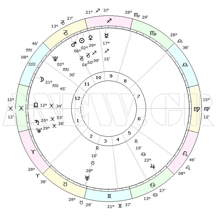 | | ΘΕΣΕΙΣ ΠΛΑΝΗΤΩΝ ΑΣΤΡΟΛΟΓΙΚΟΥ ΧΑΡΤΗ ΤΗΣ ΣΤΙΓΜΗΣ ΑΥΤΗΣ | | | | Πλανήτης | Ζώδιο | Μοίρες | Δεκαήμ. | Σε οίκο | Απόκλιση | | Ακμές των οίκων | | Ηλιος | Αιγόκερως | 02°35' | Πρώτο | 1 | 23 S 24 | | 1ος | 11°01' | Τοξότης | | Σελήνη | Υδροχόος | 18°51' | Δεύτερο | 2 | 17 S 01 | | 2ος | 13°56' | Αιγόκερως | | Ερμής | Τοξότης | 16°55' | Δεύτερο | 1 | 22 S 26 | | 3ος | 21°30' | Υδροχόος | | Αφροδίτη | Τοξότης | 29°22' | Τρίτο | 1 | 23 S 38 | | 4ος | 27°27' | Ιχθείς | | Αρης | Αιγόκερως | 06°43' | Πρώτο | 1 | 24 S 06 | | 5ος | 26°54' | Κριός | | Δίας | Καρκίνος | 22°20'R | Τρίτο | 8 | 21 N 48 | | 6ος | 20°31' | Ταύρος | | Κρόνος | Ιχθείς | 25°53' | Τρίτο | 3 | 03 S 44 | | 7ος | 11°01' | Δίδυμοι | | Ουρανός | Ταύρος | 28°11'R | Τρίτο | 6 | 19 N 33 | | 8ος | 13°56' | Καρκίνος | | Ποσειδώνας | Ιχθείς | 29°26' | Τρίτο | 4 | 01 S 27 | | 9ος | 21°30' | Λέων | | Πλούτωνας | Υδροχόος | 02°30' | Πρώτο | 2 | 23 S 16 | | 10ος | 27°27' | Παρθένος | | Β. Δεσμός | Ιχθείς | 12°35' | Δεύτερο | 3 | 06 S 50 | | 11ος | 26°54' | Ζυγός | | Ωροσκόπος | Τοξότης | 11°01' | Δεύτερο | | | 12ος | 20°31' | Σκορπιός | | Μεσουράνημα | Παρθένος | 27°27' | Τρίτο | | | |