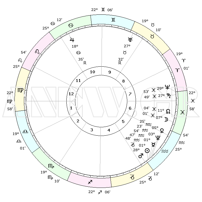 | | ΘΕΣΕΙΣ ΠΛΑΝΗΤΩΝ ΑΣΤΡΟΛΟΓΙΚΟΥ ΧΑΡΤΗ ΤΗΣ ΣΤΙΓΜΗΣ ΑΥΤΗΣ | | | | Πλανήτης | Ζώδιο | Μοίρες | Δεκαήμ. | Σε οίκο | Απόκλιση | | Ακμές των οίκων | | Ηλιος | Υδροχόος | 01°16' | Πρώτο | 11 | 19 S 52 | | 1ος | 07°20' | Ιχθείς | | Σελήνη | Ιχθείς | 00°20' | Πρώτο | 12 | 12 S 07 | | 2ος | 21°59' | Κριός | | Ερμής | Υδροχόος | 01°02' | Πρώτο | 11 | 21 S 55 | | 3ος | 23°17' | Ταύρος | | Αφροδίτη | Υδροχόος | 04°46' | Πρώτο | 12 | 20 S 11 | | 4ος | 17°01' | Δίδυμοι | | Αρης | Αιγόκερως | 28°23' | Τρίτο | 11 | 21 S 27 | | 5ος | 08°43' | Καρκίνος | | Δίας | Καρκίνος | 18°39'R | Δεύτερο | 5 | 22 N 25 | | 6ος | 03°04' | Λέων | | Κρόνος | Ιχθείς | 27°46' | Τρίτο | 1 | 02 S 54 | | 7ος | 07°20' | Παρθένος | | Ουρανός | Ταύρος | 27°32'R | Τρίτο | 3 | 19 N 25 | | 8ος | 21°59' | Ζυγός | | Ποσειδώνας | Ιχθείς | 29°52' | Τρίτο | 1 | 01 S 16 | | 9ος | 23°17' | Σκορπιός | | Πλούτωνας | Υδροχόος | 03°22' | Πρώτο | 12 | 23 S 05 | | 10ος | 17°01' | Τοξότης | | Β. Δεσμός | Ιχθείς | 11°06' | Δεύτερο | 1 | 07 S 24 | | 11ος | 08°43' | Αιγόκερως | | Ωροσκόπος | Ιχθείς | 07°20' | Πρώτο | | | 12ος | 03°04' | Υδροχόος | | Μεσουράνημα | Τοξότης | 17°01' | Δεύτερο | | | |