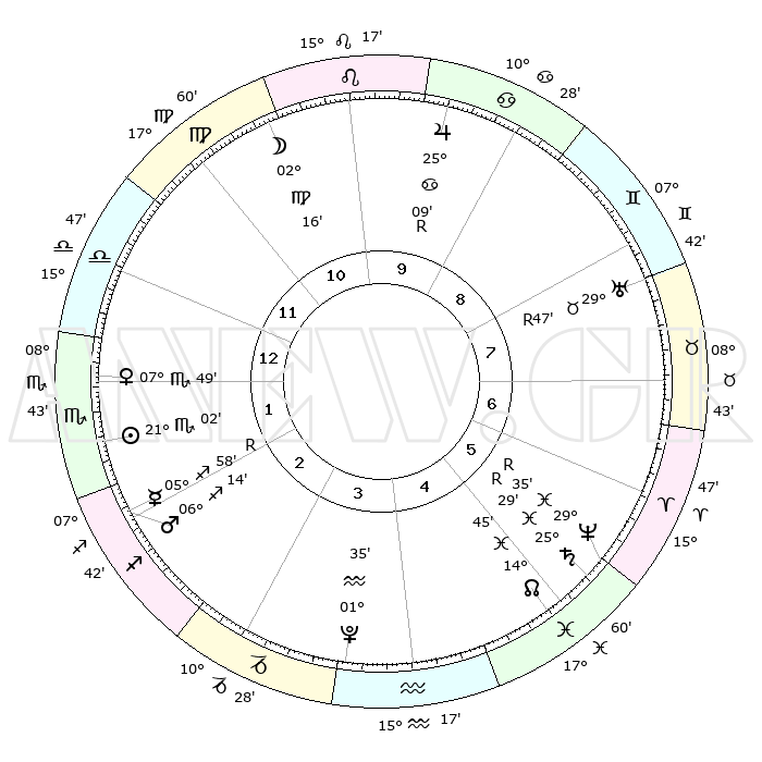 | | ΘΕΣΕΙΣ ΠΛΑΝΗΤΩΝ ΑΣΤΡΟΛΟΓΙΚΟΥ ΧΑΡΤΗ ΤΗΣ ΣΤΙΓΜΗΣ ΑΥΤΗΣ | | | | Πλανήτης | Ζώδιο | Μοίρες | Δεκαήμ. | Σε οίκο | Απόκλιση | | Ακμές των οίκων | | Ηλιος | Σκορπιός | 20°58' | Τρίτο | 2 | 18 S 00 | | 1ος | 18°54' | Ζυγός | | Σελήνη | Παρθένος | 01°24' | Πρώτο | 11 | 12 N 11 | | 2ος | 16°41' | Σκορπιός | | Ερμής | Τοξότης | 06°00'R | Πρώτο | 2 | 23 S 00 | | 3ος | 17°55' | Τοξότης | | Αφροδίτη | Σκορπιός | 07°44' | Πρώτο | 1 | 12 S 54 | | 4ος | 21°27' | Αιγόκερως | | Αρης | Τοξότης | 06°11' | Πρώτο | 2 | 21 S 50 | | 5ος | 24°24' | Υδροχόος | | Δίας | Καρκίνος | 25°09'R | Τρίτο | 10 | 21 N 13 | | 6ος | 23°55' | Ιχθείς | | Κρόνος | Ιχθείς | 25°29'R | Τρίτο | 6 | 04 S 02 | | 7ος | 18°54' | Κριός | | Ουρανός | Ταύρος | 29°47'R | Τρίτο | 8 | 19 N 54 | | 8ος | 16°40' | Ταύρος | | Ποσειδώνας | Ιχθείς | 29°35'R | Τρίτο | 6 | 01 S 25 | | 9ος | 17°55' | Δίδυμοι | | Πλούτωνας | Υδροχόος | 01°35' | Πρώτο | 4 | 23 S 29 | | 10ος | 21°27' | Καρκίνος | | Β. Δεσμός | Ιχθείς | 14°45' | Δεύτερο | 5 | 06 S 00 | | 11ος | 24°24' | Λέων | | Ωροσκόπος | Ζυγός | 18°54' | Δεύτερο | | | 12ος | 23°55' | Παρθένος | | Μεσουράνημα | Καρκίνος | 21°27' | Τρίτο | | | |
