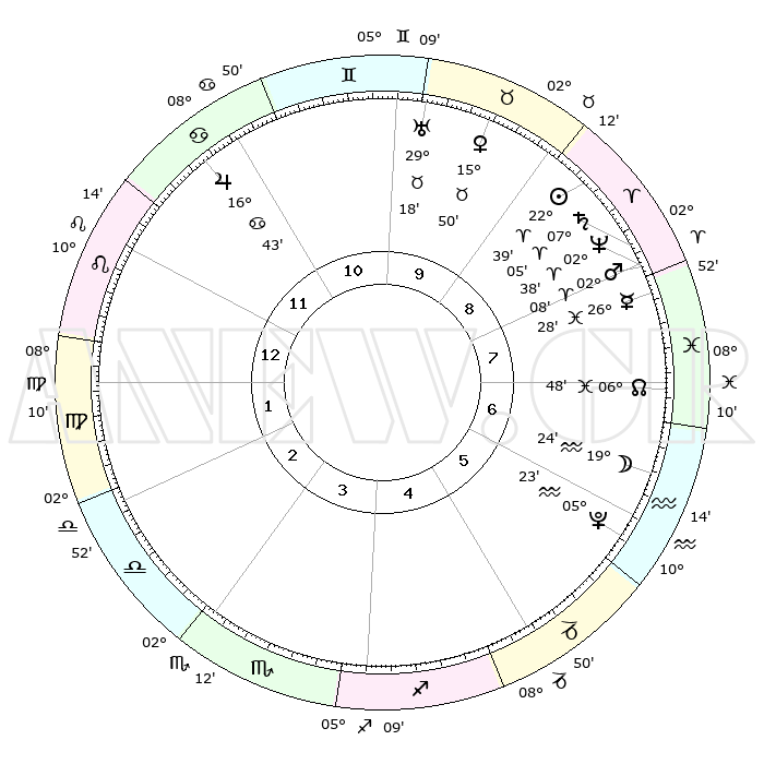 | | ΘΕΣΕΙΣ ΠΛΑΝΗΤΩΝ ΑΣΤΡΟΛΟΓΙΚΟΥ ΧΑΡΤΗ ΤΗΣ ΣΤΙΓΜΗΣ ΑΥΤΗΣ | | | | Πλανήτης | Ζώδιο | Μοίρες | Δεκαήμ. | Σε οίκο | Απόκλιση | | Ακμές των οίκων | | Ηλιος | Κριός | 22°35' | Τρίτο | 9 | 08 N 47 | | 1ος | 19°59' | Λέων | | Σελήνη | Υδροχόος | 18°36' | Δεύτερο | 6 | 16 S 53 | | 2ος | 12°48' | Παρθένος | | Ερμής | Ιχθείς | 26°23' | Τρίτο | 8 | 03 S 43 | | 3ος | 10°26' | Ζυγός | | Αφροδίτη | Ταύρος | 15°45' | Δεύτερο | 10 | 16 N 36 | | 4ος | 13°06' | Σκορπιός | | Αρης | Κριός | 02°05' | Πρώτο | 8 | 00 S 05 | | 5ος | 18°01' | Τοξότης | | Δίας | Καρκίνος | 16°43' | Δεύτερο | 11 | 22 N 46 | | 6ος | 20°55' | Αιγόκερως | | Κρόνος | Κριός | 07°05' | Πρώτο | 8 | 00 N 51 | | 7ος | 19°59' | Υδροχόος | | Ουρανός | Ταύρος | 29°18' | Τρίτο | 10 | 19 N 50 | | 8ος | 12°48' | Ιχθείς | | Ποσειδώνας | Κριός | 02°38' | Πρώτο | 8 | 00 S 09 | | 9ος | 10°26' | Κριός | | Πλούτωνας | Υδροχόος | 05°22' | Πρώτο | 6 | 22 S 47 | | 10ος | 13°06' | Ταύρος | | Β. Δεσμός | Ιχθείς | 06°48' | Πρώτο | 7 | 09 S 01 | | 11ος | 18°01' | Δίδυμοι | | Ωροσκόπος | Λέων | 19°59' | Δεύτερο | | | 12ος | 20°55' | Καρκίνος | | Μεσουράνημα | Ταύρος | 13°06' | Δεύτερο | | | |