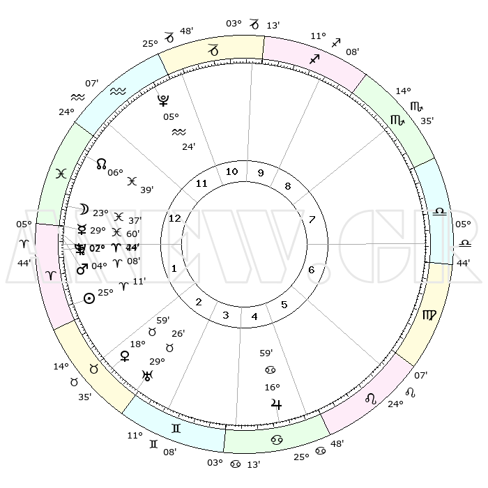| | ΘΕΣΕΙΣ ΠΛΑΝΗΤΩΝ ΑΣΤΡΟΛΟΓΙΚΟΥ ΧΑΡΤΗ ΤΗΣ ΣΤΙΓΜΗΣ ΑΥΤΗΣ | | | | Πλανήτης | Ζώδιο | Μοίρες | Δεκαήμ. | Σε οίκο | Απόκλιση | | Ακμές των οίκων | | Ηλιος | Κριός | 25°07' | Τρίτο | 2 | 09 N 43 | | 1ος | 28°19' | Υδροχόος | | Σελήνη | Ιχθείς | 22°43' | Τρίτο | 1 | 01 S 42 | | 2ος | 13°52' | Κριός | | Ερμής | Ιχθείς | 29°54' | Τρίτο | 1 | 02 S 25 | | 3ος | 16°55' | Ταύρος | | Αφροδίτη | Ταύρος | 18°54' | Δεύτερο | 3 | 17 N 36 | | 4ος | 11°29' | Δίδυμοι | | Αρης | Κριός | 04°05' | Πρώτο | 1 | 00 N 43 | | 5ος | 03°10' | Καρκίνος | | Δίας | Καρκίνος | 16°58' | Δεύτερο | 5 | 22 N 44 | | 6ος | 26°34' | Καρκίνος | | Κρόνος | Κριός | 07°24' | Πρώτο | 1 | 00 N 58 | | 7ος | 28°19' | Λέων | | Ουρανός | Ταύρος | 29°26' | Τρίτο | 3 | 19 N 52 | | 8ος | 13°52' | Ζυγός | | Ποσειδώνας | Κριός | 02°44' | Πρώτο | 1 | 00 S 07 | | 9ος | 16°55' | Σκορπιός | | Πλούτωνας | Υδροχόος | 05°24' | Πρώτο | 12 | 22 S 47 | | 10ος | 11°29' | Τοξότης | | Β. Δεσμός | Ιχθείς | 06°40' | Πρώτο | 1 | 09 S 04 | | 11ος | 03°10' | Αιγόκερως | | Ωροσκόπος | Υδροχόος | 28°19' | Τρίτο | | | 12ος | 26°34' | Αιγόκερως | | Μεσουράνημα | Τοξότης | 11°29' | Δεύτερο | | | |