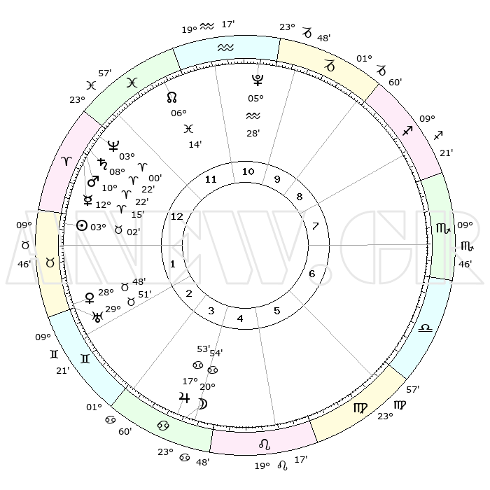 | | ΘΕΣΕΙΣ ΠΛΑΝΗΤΩΝ ΑΣΤΡΟΛΟΓΙΚΟΥ ΧΑΡΤΗ ΤΗΣ ΣΤΙΓΜΗΣ ΑΥΤΗΣ | | | | Πλανήτης | Ζώδιο | Μοίρες | Δεκαήμ. | Σε οίκο | Απόκλιση | | Ακμές των οίκων | | Ηλιος | Ταύρος | 02°54' | Πρώτο | 2 | 12 N 28 | | 1ος | 20°12' | Υδροχόος | | Σελήνη | Καρκίνος | 18°54' | Δεύτερο | 5 | 25 N 53 | | 2ος | 06°00' | Κριός | | Ερμής | Κριός | 12°01' | Δεύτερο | 2 | 02 N 25 | | 3ος | 10°41' | Ταύρος | | Αφροδίτη | Ταύρος | 28°37' | Τρίτο | 3 | 20 N 22 | | 4ος | 06°10' | Δίδυμοι | | Αρης | Κριός | 10°15' | Δεύτερο | 2 | 03 N 12 | | 5ος | 27°59' | Δίδυμοι | | Δίας | Καρκίνος | 17°52' | Δεύτερο | 5 | 22 N 37 | | 6ος | 20°38' | Καρκίνος | | Κρόνος | Κριός | 08°21' | Πρώτο | 2 | 01 N 20 | | 7ος | 20°12' | Λέων | | Ουρανός | Ταύρος | 29°51' | Τρίτο | 3 | 19 N 57 | | 8ος | 06°00' | Ζυγός | | Ποσειδώνας | Κριός | 03°00' | Πρώτο | 1 | 00 S 01 | | 9ος | 10°41' | Σκορπιός | | Πλούτωνας | Υδροχόος | 05°28' | Πρώτο | 12 | 22 S 48 | | 10ος | 06°10' | Τοξότης | | Β. Δεσμός | Ιχθείς | 06°14' | Πρώτο | 1 | 09 S 13 | | 11ος | 27°59' | Τοξότης | | Ωροσκόπος | Υδροχόος | 20°12' | Τρίτο | | | 12ος | 20°38' | Αιγόκερως | | Μεσουράνημα | Τοξότης | 06°10' | Πρώτο | | | |