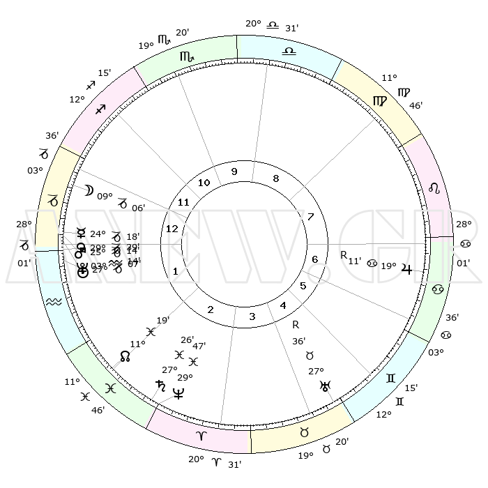 | | ΘΕΣΕΙΣ ΠΛΑΝΗΤΩΝ ΑΣΤΡΟΛΟΓΙΚΟΥ ΧΑΡΤΗ ΤΗΣ ΣΤΙΓΜΗΣ ΑΥΤΗΣ | | | | Πλανήτης | Ζώδιο | Μοίρες | Δεκαήμ. | Σε οίκο | Απόκλιση | | Ακμές των οίκων | | Ηλιος | Αιγόκερως | 27°03' | Τρίτο | 1 | 20 S 45 | | 1ος | 00°04' | Αιγόκερως | | Σελήνη | Αιγόκερως | 08°11' | Πρώτο | 1 | 27 S 41 | | 2ος | 07°14' | Υδροχόος | | Ερμής | Αιγόκερως | 24°10' | Τρίτο | 1 | 23 S 09 | | 3ος | 17°14' | Ιχθείς | | Αφροδίτη | Αιγόκερως | 29°33' | Τρίτο | 1 | 21 S 15 | | 4ος | 21°10' | Κριός | | Αρης | Αιγόκερως | 25°10' | Τρίτο | 1 | 22 S 04 | | 5ος | 17°28' | Ταύρος | | Δίας | Καρκίνος | 19°11'R | Δεύτερο | 7 | 22 N 20 | | 6ος | 09°16' | Δίδυμοι | | Κρόνος | Ιχθείς | 27°25' | Τρίτο | 3 | 03 S 03 | | 7ος | 00°04' | Καρκίνος | | Ουρανός | Ταύρος | 27°36'R | Τρίτο | 5 | 19 N 26 | | 8ος | 07°14' | Λέων | | Ποσειδώνας | Ιχθείς | 29°47' | Τρίτο | 3 | 01 S 18 | | 9ος | 17°14' | Παρθένος | | Πλούτωνας | Υδροχόος | 03°14' | Πρώτο | 1 | 23 S 07 | | 10ος | 21°10' | Ζυγός | | Β. Δεσμός | Ιχθείς | 11°19' | Δεύτερο | 2 | 07 S 19 | | 11ος | 17°28' | Σκορπιός | | Ωροσκόπος | Αιγόκερως | 00°04' | Πρώτο | | | 12ος | 09°16' | Τοξότης | | Μεσουράνημα | Ζυγός | 21°10' | Τρίτο | | | |