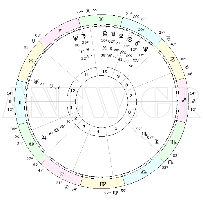 | | ΘΕΣΕΙΣ ΠΛΑΝΗΤΩΝ ΑΣΤΡΟΛΟΓΙΚΟΥ ΧΑΡΤΗ ΤΗΣ ΣΤΙΓΜΗΣ ΑΥΤΗΣ | | | | Πλανήτης | Ζώδιο | Μοίρες | Δεκαήμ. | Σε οίκο | Απόκλιση | | Ακμές των οίκων | | Ηλιος | Υδροχόος | 19°37' | Δεύτερο | 10 | 14 S 56 | | 1ος | 13°55' | Ταύρος | | Σελήνη | Σκορπιός | 07°01' | Πρώτο | 6 | 18 S 03 | | 2ος | 12°25' | Δίδυμοι | | Ερμής | Ιχθείς | 02°31' | Πρώτο | 11 | 11 S 39 | | 3ος | 04°45' | Καρκίνος | | Αφροδίτη | Υδροχόος | 27°27' | Τρίτο | 11 | 13 S 43 | | 4ος | 26°40' | Καρκίνος | | Αρης | Υδροχόος | 12°31' | Δεύτερο | 10 | 18 S 04 | | 5ος | 22°41' | Λέων | | Δίας | Καρκίνος | 16°36'R | Δεύτερο | 3 | 22 N 43 | | 6ος | 28°11' | Παρθένος | | Κρόνος | Ιχθείς | 29°31' | Τρίτο | 12 | 02 S 11 | | 7ος | 13°55' | Σκορπιός | | Ουρανός | Ταύρος | 27°28' | Τρίτο | 1 | 19 N 24 | | 8ος | 12°25' | Τοξότης | | Ποσειδώνας | Κριός | 00°21' | Πρώτο | 12 | 01 S 04 | | 9ος | 04°45' | Αιγόκερως | | Πλούτωνας | Υδροχόος | 03°56' | Πρώτο | 10 | 22 S 59 | | 10ος | 26°40' | Αιγόκερως | | Β. Δεσμός | Ιχθείς | 10°08' | Δεύτερο | 11 | 07 S 46 | | 11ος | 22°41' | Υδροχόος | | Ωροσκόπος | Ταύρος | 13°55' | Δεύτερο | | | 12ος | 28°11' | Ιχθείς | | Μεσουράνημα | Αιγόκερως | 26°40' | Τρίτο | | | |