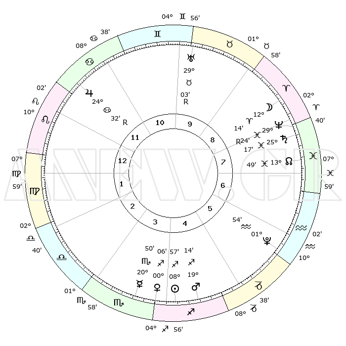 | | ΘΕΣΕΙΣ ΠΛΑΝΗΤΩΝ ΑΣΤΡΟΛΟΓΙΚΟΥ ΧΑΡΤΗ ΤΗΣ ΣΤΙΓΜΗΣ ΑΥΤΗΣ | | | | Πλανήτης | Ζώδιο | Μοίρες | Δεκαήμ. | Σε οίκο | Απόκλιση | | Ακμές των οίκων | | Ηλιος | Τοξότης | 08°55' | Πρώτο | 4 | 21 S 47 | | 1ος | 27°15' | Λέων | | Σελήνη | Κριός | 11°42' | Δεύτερο | 8 | 06 N 46 | | 2ος | 20°49' | Παρθένος | | Ερμής | Σκορπιός | 20°49' | Τρίτο | 3 | 15 S 27 | | 3ος | 19°14' | Ζυγός | | Αφροδίτη | Τοξότης | 00°03' | Πρώτο | 4 | 19 S 28 | | 4ος | 22°07' | Σκορπιός | | Αρης | Τοξότης | 19°13' | Δεύτερο | 4 | 23 S 39 | | 5ος | 26°29' | Τοξότης | | Δίας | Καρκίνος | 24°32'R | Τρίτο | 11 | 21 N 22 | | 6ος | 28°40' | Αιγόκερως | | Κρόνος | Ιχθείς | 25°17' | Τρίτο | 8 | 04 S 03 | | 7ος | 27°15' | Υδροχόος | | Ουρανός | Ταύρος | 29°03'R | Τρίτο | 10 | 19 N 44 | | 8ος | 20°49' | Ιχθείς | | Ποσειδώνας | Ιχθείς | 29°24'R | Τρίτο | 8 | 01 S 29 | | 9ος | 19°14' | Κριός | | Πλούτωνας | Υδροχόος | 01°54' | Πρώτο | 6 | 23 S 24 | | 10ος | 22°07' | Ταύρος | | Β. Δεσμός | Ιχθείς | 13°49' | Δεύτερο | 7 | 06 S 22 | | 11ος | 26°29' | Δίδυμοι | | Ωροσκόπος | Λέων | 27°15' | Τρίτο | | | 12ος | 28°40' | Καρκίνος | | Μεσουράνημα | Ταύρος | 22°07' | Τρίτο | | | |