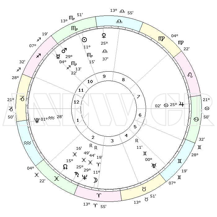 | | ΘΕΣΕΙΣ ΠΛΑΝΗΤΩΝ ΑΣΤΡΟΛΟΓΙΚΟΥ ΧΑΡΤΗ ΤΗΣ ΣΤΙΓΜΗΣ ΑΥΤΗΣ | | | | Πλανήτης | Ζώδιο | Μοίρες | Δεκαήμ. | Σε οίκο | Απόκλιση | | Ακμές των οίκων | | Ηλιος | Σκορπιός | 10°58' | Δεύτερο | 1 | 15 S 07 | | 1ος | 25°44' | Ζυγός | | Σελήνη | Κριός | 07°15' | Πρώτο | 6 | 04 N 30 | | 2ος | 23°54' | Σκορπιός | | Ερμής | Τοξότης | 04°10' | Πρώτο | 2 | 23 S 48 | | 3ος | 25°33' | Τοξότης | | Αφροδίτη | Ζυγός | 25°16' | Τρίτο | 12 | 08 S 26 | | 4ος | 29°28' | Αιγόκερως | | Αρης | Σκορπιός | 29°01' | Τρίτο | 2 | 20 S 20 | | 5ος | 02°25' | Ιχθείς | | Δίας | Καρκίνος | 25°02' | Τρίτο | 9 | 21 N 13 | | 6ος | 01°27' | Κριός | | Κρόνος | Ιχθείς | 25°50'R | Τρίτο | 5 | 03 S 55 | | 7ος | 25°44' | Κριός | | Ουρανός | Δίδυμοι | 00°11'R | Πρώτο | 8 | 19 N 59 | | 8ος | 23°54' | Ταύρος | | Ποσειδώνας | Ιχθείς | 29°45'R | Τρίτο | 5 | 01 S 21 | | 9ος | 25°33' | Δίδυμοι | | Πλούτωνας | Υδροχόος | 01°28' | Πρώτο | 4 | 23 S 30 | | 10ος | 29°28' | Καρκίνος | | Β. Δεσμός | Ιχθείς | 15°17' | Δεύτερο | 5 | 05 S 48 | | 11ος | 02°25' | Παρθένος | | Ωροσκόπος | Ζυγός | 25°44' | Τρίτο | | | 12ος | 01°27' | Ζυγός | | Μεσουράνημα | Καρκίνος | 29°28' | Τρίτο | | | |