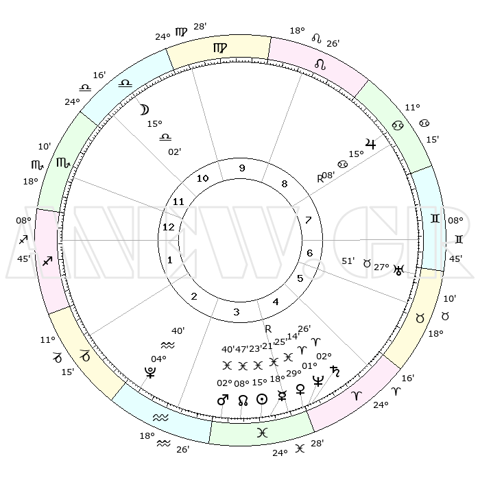 | | ΘΕΣΕΙΣ ΠΛΑΝΗΤΩΝ ΑΣΤΡΟΛΟΓΙΚΟΥ ΧΑΡΤΗ ΤΗΣ ΣΤΙΓΜΗΣ ΑΥΤΗΣ | | | | Πλανήτης | Ζώδιο | Μοίρες | Δεκαήμ. | Σε οίκο | Απόκλιση | | Ακμές των οίκων | | Ηλιος | Ιχθείς | 15°20' | Δεύτερο | 4 | 05 S 47 | | 1ος | 21°15' | Σκορπιός | | Σελήνη | Ζυγός | 14°17' | Δεύτερο | 11 | 08 S 26 | | 2ος | 21°19' | Τοξότης | | Ερμής | Ιχθείς | 18°24'R | Δεύτερο | 4 | 01 S 11 | | 3ος | 25°39' | Αιγόκερως | | Αφροδίτη | Ιχθείς | 29°20' | Τρίτο | 4 | 01 S 26 | | 4ος | 01°20' | Ιχθείς | | Αρης | Ιχθείς | 02°37' | Πρώτο | 4 | 11 S 34 | | 5ος | 03°18' | Κριός | | Δίας | Καρκίνος | 15°08'R | Δεύτερο | 8 | 22 N 55 | | 6ος | 29°32' | Κριός | | Κρόνος | Κριός | 02°26' | Πρώτο | 4 | 00 S 59 | | 7ος | 21°15' | Ταύρος | | Ουρανός | Ταύρος | 27°51' | Τρίτο | 7 | 19 N 30 | | 8ος | 21°19' | Δίδυμοι | | Ποσειδώνας | Κριός | 01°14' | Πρώτο | 4 | 00 S 43 | | 9ος | 25°39' | Καρκίνος | | Πλούτωνας | Υδροχόος | 04°40' | Πρώτο | 3 | 22 S 51 | | 10ος | 01°20' | Παρθένος | | Β. Δεσμός | Ιχθείς | 08°47' | Πρώτο | 4 | 08 S 16 | | 11ος | 03°18' | Ζυγός | | Ωροσκόπος | Σκορπιός | 21°15' | Τρίτο | | | 12ος | 29°32' | Ζυγός | | Μεσουράνημα | Παρθένος | 01°20' | Πρώτο | | | |