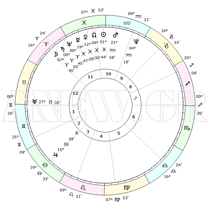 | | ΘΕΣΕΙΣ ΠΛΑΝΗΤΩΝ ΑΣΤΡΟΛΟΓΙΚΟΥ ΧΑΡΤΗ ΤΗΣ ΣΤΙΓΜΗΣ ΑΥΤΗΣ | | | | Πλανήτης | Ζώδιο | Μοίρες | Δεκαήμ. | Σε οίκο | Απόκλιση | | Ακμές των οίκων | | Ηλιος | Ιχθείς | 01°40' | Πρώτο | 11 | 10 S 53 | | 1ος | 20°05' | Κριός | | Σελήνη | Κριός | 06°38' | Πρώτο | 12 | 04 N 54 | | 2ος | 25°04' | Ταύρος | | Ερμής | Ιχθείς | 19°43' | Δεύτερο | 12 | 02 S 51 | | 3ος | 19°43' | Δίδυμοι | | Αφροδίτη | Ιχθείς | 12°22' | Δεύτερο | 12 | 08 S 16 | | 4ος | 11°27' | Καρκίνος | | Αρης | Υδροχόος | 21°54' | Τρίτο | 11 | 15 S 14 | | 5ος | 04°58' | Λέων | | Δίας | Καρκίνος | 15°40'R | Δεύτερο | 4 | 22 N 51 | | 6ος | 05°47' | Παρθένος | | Κρόνος | Κριός | 00°49' | Πρώτο | 12 | 01 S 38 | | 7ος | 20°05' | Ζυγός | | Ουρανός | Ταύρος | 27°35' | Τρίτο | 2 | 19 N 26 | | 8ος | 25°04' | Σκορπιός | | Ποσειδώνας | Κριός | 00°45' | Πρώτο | 12 | 00 S 54 | | 9ος | 19°43' | Τοξότης | | Πλούτωνας | Υδροχόος | 04°18' | Πρώτο | 10 | 22 S 55 | | 10ος | 11°27' | Αιγόκερως | | Β. Δεσμός | Ιχθείς | 09°30' | Πρώτο | 12 | 08 S 00 | | 11ος | 04°59' | Υδροχόος | | Ωροσκόπος | Κριός | 20°05' | Τρίτο | | | 12ος | 05°47' | Ιχθείς | | Μεσουράνημα | Αιγόκερως | 11°27' | Δεύτερο | | | |