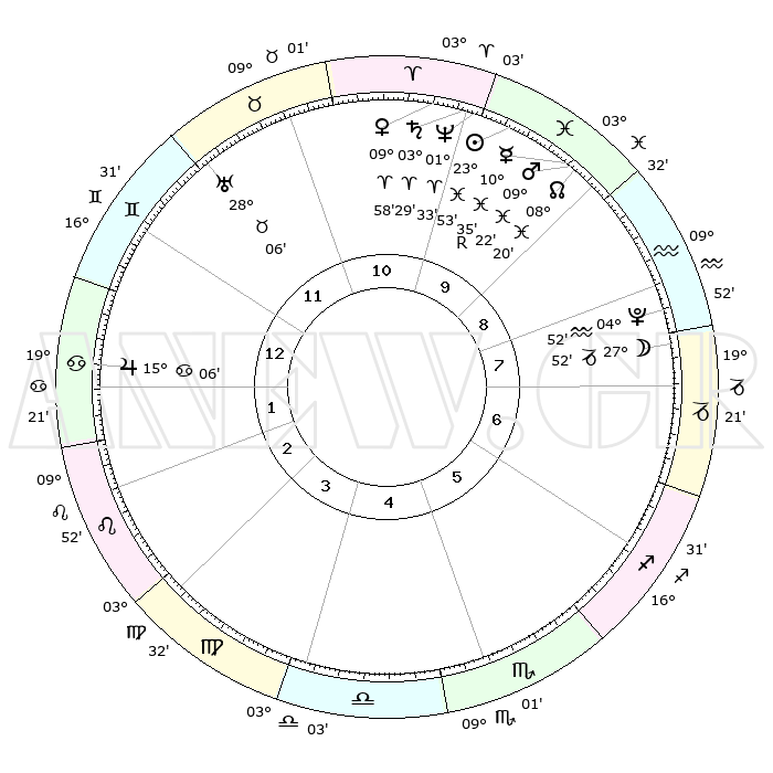 | | ΘΕΣΕΙΣ ΠΛΑΝΗΤΩΝ ΑΣΤΡΟΛΟΓΙΚΟΥ ΧΑΡΤΗ ΤΗΣ ΣΤΙΓΜΗΣ ΑΥΤΗΣ | | | | Πλανήτης | Ζώδιο | Μοίρες | Δεκαήμ. | Σε οίκο | Απόκλιση | | Ακμές των οίκων | | Ηλιος | Ιχθείς | 23°50' | Τρίτο | 10 | 02 S 27 | | 1ος | 03°50' | Καρκίνος | | Σελήνη | Αιγόκερως | 27°15' | Τρίτο | 8 | 24 S 09 | | 2ος | 24°26' | Καρκίνος | | Ερμής | Ιχθείς | 10°37'R | Δεύτερο | 9 | 05 S 14 | | 3ος | 16°31' | Λέων | | Αφροδίτη | Κριός | 09°55' | Πρώτο | 10 | 02 N 57 | | 4ος | 13°27' | Παρθένος | | Αρης | Ιχθείς | 09°19' | Πρώτο | 9 | 09 S 05 | | 5ος | 17°58' | Ζυγός | | Δίας | Καρκίνος | 15°06' | Δεύτερο | 1 | 22 N 56 | | 6ος | 27°38' | Σκορπιός | | Κρόνος | Κριός | 03°28' | Πρώτο | 10 | 00 S 34 | | 7ος | 03°50' | Αιγόκερως | | Ουρανός | Ταύρος | 28°06' | Τρίτο | 12 | 19 N 34 | | 8ος | 24°26' | Αιγόκερως | | Ποσειδώνας | Κριός | 01°33' | Πρώτο | 10 | 00 S 35 | | 9ος | 16°31' | Υδροχόος | | Πλούτωνας | Υδροχόος | 04°52' | Πρώτο | 8 | 22 S 50 | | 10ος | 13°27' | Ιχθείς | | Β. Δεσμός | Ιχθείς | 08°20' | Πρώτο | 9 | 08 S 27 | | 11ος | 17°58' | Κριός | | Ωροσκόπος | Καρκίνος | 03°50' | Πρώτο | | | 12ος | 27°38' | Ταύρος | | Μεσουράνημα | Ιχθείς | 13°27' | Δεύτερο | | | |
