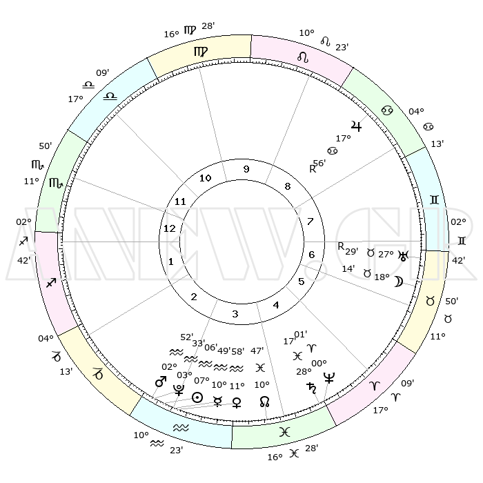| | ΘΕΣΕΙΣ ΠΛΑΝΗΤΩΝ ΑΣΤΡΟΛΟΓΙΚΟΥ ΧΑΡΤΗ ΤΗΣ ΣΤΙΓΜΗΣ ΑΥΤΗΣ | | | | Πλανήτης | Ζώδιο | Μοίρες | Δεκαήμ. | Σε οίκο | Απόκλιση | | Ακμές των οίκων | | Ηλιος | Υδροχόος | 07°02' | Πρώτο | 3 | 18 S 31 | | 1ος | 13°19' | Σκορπιός | | Σελήνη | Ταύρος | 17°17' | Δεύτερο | 7 | 21 N 36 | | 2ος | 12°40' | Τοξότης | | Ερμής | Υδροχόος | 10°42' | Δεύτερο | 3 | 19 S 32 | | 3ος | 15°56' | Αιγόκερως | | Αφροδίτη | Υδροχόος | 11°53' | Δεύτερο | 3 | 18 S 27 | | 4ος | 21°06' | Υδροχόος | | Αρης | Υδροχόος | 02°49' | Πρώτο | 3 | 20 S 31 | | 5ος | 23°37' | Ιχθείς | | Δίας | Καρκίνος | 17°56'R | Δεύτερο | 9 | 22 N 31 | | 6ος | 20°51' | Κριός | | Κρόνος | Ιχθείς | 28°17' | Τρίτο | 5 | 02 S 41 | | 7ος | 13°20' | Ταύρος | | Ουρανός | Ταύρος | 27°29'R | Τρίτο | 7 | 19 N 24 | | 8ος | 12°40' | Δίδυμοι | | Ποσειδώνας | Κριός | 00°01' | Πρώτο | 5 | 01 S 12 | | 9ος | 15°56' | Καρκίνος | | Πλούτωνας | Υδροχόος | 03°32' | Πρώτο | 3 | 23 S 03 | | 10ος | 21°06' | Λέων | | Β. Δεσμός | Ιχθείς | 10°48' | Δεύτερο | 4 | 07 S 31 | | 11ος | 23°37' | Παρθένος | | Ωροσκόπος | Σκορπιός | 13°19' | Δεύτερο | | | 12ος | 20°51' | Ζυγός | | Μεσουράνημα | Λέων | 21°06' | Τρίτο | | | |