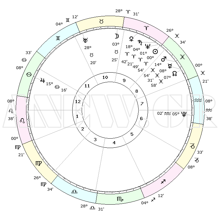 | | ΘΕΣΕΙΣ ΠΛΑΝΗΤΩΝ ΑΣΤΡΟΛΟΓΙΚΟΥ ΧΑΡΤΗ ΤΗΣ ΣΤΙΓΜΗΣ ΑΥΤΗΣ | | | | Πλανήτης | Ζώδιο | Μοίρες | Δεκαήμ. | Σε οίκο | Απόκλιση | | Ακμές των οίκων | | Ηλιος | Κριός | 00°49' | Πρώτο | 10 | 00 N 20 | | 1ος | 17°10' | Καρκίνος | | Σελήνη | Ταύρος | 02°21' | Πρώτο | 10 | 16 N 15 | | 2ος | 07°38' | Λέων | | Ερμής | Ιχθείς | 08°31' | Πρώτο | 9 | 07 S 36 | | 3ος | 01°01' | Παρθένος | | Αφροδίτη | Κριός | 18°37' | Δεύτερο | 10 | 06 N 31 | | 4ος | 00°11' | Ζυγός | | Αρης | Ιχθείς | 14°51' | Δεύτερο | 9 | 06 S 57 | | 5ος | 06°02' | Σκορπιός | | Δίας | Καρκίνος | 15°15' | Δεύτερο | 12 | 22 N 55 | | 6ος | 13°54' | Τοξότης | | Κρόνος | Κριός | 04°21' | Πρώτο | 10 | 00 S 14 | | 7ος | 17°10' | Αιγόκερως | | Ουρανός | Ταύρος | 28°20' | Τρίτο | 11 | 19 N 37 | | 8ος | 07°38' | Υδροχόος | | Ποσειδώνας | Κριός | 01°49' | Πρώτο | 10 | 00 S 29 | | 9ος | 01°01' | Ιχθείς | | Πλούτωνας | Υδροχόος | 05°01' | Πρώτο | 7 | 22 S 48 | | 10ος | 00°11' | Κριός | | Β. Δεσμός | Ιχθείς | 07°58' | Πρώτο | 9 | 08 S 35 | | 11ος | 06°02' | Ταύρος | | Ωροσκόπος | Καρκίνος | 17°10' | Δεύτερο | | | 12ος | 13°54' | Δίδυμοι | | Μεσουράνημα | Κριός | 00°11' | Πρώτο | | | |