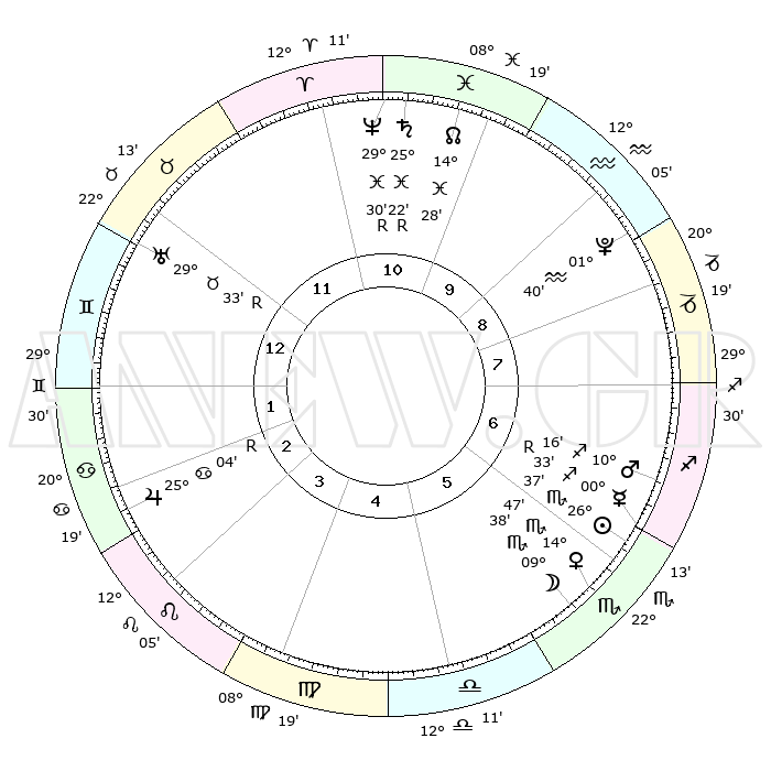 | | ΘΕΣΕΙΣ ΠΛΑΝΗΤΩΝ ΑΣΤΡΟΛΟΓΙΚΟΥ ΧΑΡΤΗ ΤΗΣ ΣΤΙΓΜΗΣ ΑΥΤΗΣ | | | | Πλανήτης | Ζώδιο | Μοίρες | Δεκαήμ. | Σε οίκο | Απόκλιση | | Ακμές των οίκων | | Ηλιος | Σκορπιός | 26°34' | Τρίτο | 6 | 19 S 23 | | 1ος | 09°02' | Δίδυμοι | | Σελήνη | Σκορπιός | 08°58' | Πρώτο | 6 | 18 S 17 | | 2ος | 02°11' | Καρκίνος | | Ερμής | Τοξότης | 00°38'R | Πρώτο | 6 | 20 S 20 | | 3ος | 23°24' | Καρκίνος | | Αφροδίτη | Σκορπιός | 14°42' | Δεύτερο | 6 | 15 S 11 | | 4ος | 16°57' | Λέων | | Αρης | Τοξότης | 10°13' | Δεύτερο | 7 | 22 S 32 | | 5ος | 17°03' | Παρθένος | | Δίας | Καρκίνος | 25°04'R | Τρίτο | 3 | 21 N 14 | | 6ος | 26°41' | Ζυγός | | Κρόνος | Ιχθείς | 25°22'R | Τρίτο | 11 | 04 S 03 | | 7ος | 09°02' | Τοξότης | | Ουρανός | Ταύρος | 29°34'R | Τρίτο | 12 | 19 N 51 | | 8ος | 02°11' | Αιγόκερως | | Ποσειδώνας | Ιχθείς | 29°30'R | Τρίτο | 11 | 01 S 27 | | 9ος | 23°24' | Αιγόκερως | | Πλούτωνας | Υδροχόος | 01°40' | Πρώτο | 9 | 23 S 27 | | 10ος | 16°57' | Υδροχόος | | Β. Δεσμός | Ιχθείς | 14°28' | Δεύτερο | 10 | 06 S 07 | | 11ος | 17°03' | Ιχθείς | | Ωροσκόπος | Δίδυμοι | 09°02' | Πρώτο | | | 12ος | 26°41' | Κριός | | Μεσουράνημα | Υδροχόος | 16°57' | Δεύτερο | | | |