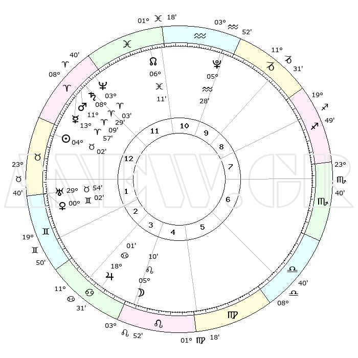 | | ΘΕΣΕΙΣ ΠΛΑΝΗΤΩΝ ΑΣΤΡΟΛΟΓΙΚΟΥ ΧΑΡΤΗ ΤΗΣ ΣΤΙΓΜΗΣ ΑΥΤΗΣ | | | | Πλανήτης | Ζώδιο | Μοίρες | Δεκαήμ. | Σε οίκο | Απόκλιση | | Ακμές των οίκων | | Ηλιος | Ταύρος | 03°59' | Πρώτο | 1 | 12 N 50 | | 1ος | 23°52' | Κριός | | Σελήνη | Λέων | 04°22' | Πρώτο | 4 | 21 N 52 | | 2ος | 27°47' | Ταύρος | | Ερμής | Κριός | 13°51' | Δεύτερο | 12 | 03 N 11 | | 3ος | 22°01' | Δίδυμοι | | Αφροδίτη | Ταύρος | 29°58' | Τρίτο | 2 | 20 N 43 | | 4ος | 13°42' | Καρκίνος | | Αρης | Κριός | 11°06' | Δεύτερο | 12 | 03 N 32 | | 5ος | 07°32' | Λέων | | Δίας | Καρκίνος | 18°01' | Δεύτερο | 4 | 22 N 36 | | 6ος | 09°04' | Παρθένος | | Κρόνος | Κριός | 08°28' | Πρώτο | 12 | 01 N 22 | | 7ος | 23°52' | Ζυγός | | Ουρανός | Ταύρος | 29°54' | Τρίτο | 2 | 19 N 58 | | 8ος | 27°47' | Σκορπιός | | Ποσειδώνας | Κριός | 03°02' | Πρώτο | 12 | 00 N 00 | | 9ος | 22°01' | Τοξότης | | Πλούτωνας | Υδροχόος | 05°28' | Πρώτο | 10 | 22 S 48 | | 10ος | 13°42' | Αιγόκερως | | Β. Δεσμός | Ιχθείς | 06°11' | Πρώτο | 11 | 09 S 15 | | 11ος | 07°32' | Υδροχόος | | Ωροσκόπος | Κριός | 23°52' | Τρίτο | | | 12ος | 09°04' | Ιχθείς | | Μεσουράνημα | Αιγόκερως | 13°42' | Δεύτερο | | | |
