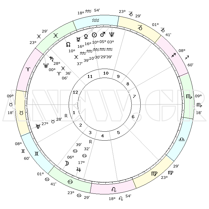| | ΘΕΣΕΙΣ ΠΛΑΝΗΤΩΝ ΑΣΤΡΟΛΟΓΙΚΟΥ ΧΑΡΤΗ ΤΗΣ ΣΤΙΓΜΗΣ ΑΥΤΗΣ | | | | Πλανήτης | Ζώδιο | Μοίρες | Δεκαήμ. | Σε οίκο | Απόκλιση | | Ακμές των οίκων | | Ηλιος | Υδροχόος | 10°26' | Δεύτερο | 11 | 17 S 37 | | 1ος | 02°55' | Κριός | | Σελήνη | Καρκίνος | 05°42' | Πρώτο | 4 | 27 N 58 | | 2ος | 12°29' | Ταύρος | | Ερμής | Υδροχόος | 16°33' | Δεύτερο | 11 | 17 S 45 | | 3ος | 09°27' | Δίδυμοι | | Αφροδίτη | Υδροχόος | 16°06' | Δεύτερο | 11 | 17 S 17 | | 4ος | 01°38' | Καρκίνος | | Αρης | Υδροχόος | 05°26' | Πρώτο | 11 | 19 S 55 | | 5ος | 24°04' | Καρκίνος | | Δίας | Καρκίνος | 17°33'R | Δεύτερο | 4 | 22 N 35 | | 6ος | 21°56' | Λέων | | Κρόνος | Ιχθείς | 28°36' | Τρίτο | 12 | 02 S 33 | | 7ος | 02°55' | Ζυγός | | Ουρανός | Ταύρος | 27°28'R | Τρίτο | 2 | 19 N 24 | | 8ος | 12°29' | Σκορπιός | | Ποσειδώνας | Κριός | 00°06' | Πρώτο | 12 | 01 S 10 | | 9ος | 09°27' | Τοξότης | | Πλούτωνας | Υδροχόος | 03°39' | Πρώτο | 11 | 23 S 02 | | 10ος | 01°38' | Αιγόκερως | | Β. Δεσμός | Ιχθείς | 10°37' | Δεύτερο | 12 | 07 S 35 | | 11ος | 24°04' | Αιγόκερως | | Ωροσκόπος | Κριός | 02°55' | Πρώτο | | | 12ος | 21°56' | Υδροχόος | | Μεσουράνημα | Αιγόκερως | 01°38' | Πρώτο | | | |