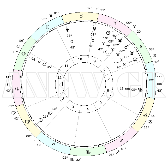 | | ΘΕΣΕΙΣ ΠΛΑΝΗΤΩΝ ΑΣΤΡΟΛΟΓΙΚΟΥ ΧΑΡΤΗ ΤΗΣ ΣΤΙΓΜΗΣ ΑΥΤΗΣ | | | | Πλανήτης | Ζώδιο | Μοίρες | Δεκαήμ. | Σε οίκο | Απόκλιση | | Ακμές των οίκων | | Ηλιος | Κριός | 10°43' | Δεύτερο | 10 | 04 N 15 | | 1ος | 24°17' | Καρκίνος | | Σελήνη | Παρθένος | 21°12' | Τρίτο | 3 | 02 N 27 | | 2ος | 14°60' | Λέων | | Ερμής | Ιχθείς | 13°14' | Δεύτερο | 9 | 07 S 43 | | 3ος | 09°17' | Παρθένος | | Αφροδίτη | Ταύρος | 00°57' | Πρώτο | 10 | 11 N 22 | | 4ος | 09°33' | Ζυγός | | Αρης | Ιχθείς | 22°41' | Τρίτο | 9 | 03 S 52 | | 5ος | 15°38' | Σκορπιός | | Δίας | Καρκίνος | 15°45' | Δεύτερο | 12 | 22 N 52 | | 6ος | 22°18' | Τοξότης | | Κρόνος | Κριός | 05°35' | Πρώτο | 9 | 00 N 16 | | 7ος | 24°17' | Αιγόκερως | | Ουρανός | Ταύρος | 28°44' | Τρίτο | 11 | 19 N 42 | | 8ος | 14°60' | Υδροχόος | | Ποσειδώνας | Κριός | 02°11' | Πρώτο | 9 | 00 S 20 | | 9ος | 09°17' | Ιχθείς | | Πλούτωνας | Υδροχόος | 05°12' | Πρώτο | 7 | 22 S 47 | | 10ος | 09°33' | Κριός | | Β. Δεσμός | Ιχθείς | 07°26' | Πρώτο | 8 | 08 S 47 | | 11ος | 15°38' | Ταύρος | | Ωροσκόπος | Καρκίνος | 24°17' | Τρίτο | | | 12ος | 22°18' | Δίδυμοι | | Μεσουράνημα | Κριός | 09°33' | Πρώτο | | | |