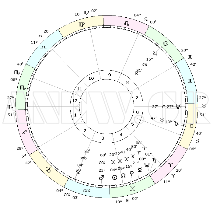 | | ΘΕΣΕΙΣ ΠΛΑΝΗΤΩΝ ΑΣΤΡΟΛΟΓΙΚΟΥ ΧΑΡΤΗ ΤΗΣ ΣΤΙΓΜΗΣ ΑΥΤΗΣ | | | | Πλανήτης | Ζώδιο | Μοίρες | Δεκαήμ. | Σε οίκο | Απόκλιση | | Ακμές των οίκων | | Ηλιος | Ιχθείς | 04°15' | Πρώτο | 4 | 09 S 57 | | 1ος | 05°31' | Σκορπιός | | Σελήνη | Ταύρος | 12°41' | Δεύτερο | 7 | 20 N 09 | | 2ος | 04°16' | Τοξότης | | Ερμής | Ιχθείς | 21°38' | Τρίτο | 5 | 01 S 30 | | 3ος | 06°42' | Αιγόκερως | | Αφροδίτη | Ιχθείς | 15°35' | Δεύτερο | 5 | 07 S 00 | | 4ος | 11°17' | Υδροχόος | | Αρης | Υδροχόος | 23°56' | Τρίτο | 4 | 14 S 34 | | 5ος | 14°06' | Ιχθείς | | Δίας | Καρκίνος | 15°31'R | Δεύτερο | 9 | 22 N 52 | | 6ος | 12°14' | Κριός | | Κρόνος | Κριός | 01°07' | Πρώτο | 5 | 01 S 31 | | 7ος | 05°31' | Ταύρος | | Ουρανός | Ταύρος | 27°37' | Τρίτο | 7 | 19 N 27 | | 8ος | 04°16' | Δίδυμοι | | Ποσειδώνας | Κριός | 00°50' | Πρώτο | 5 | 00 S 52 | | 9ος | 06°42' | Καρκίνος | | Πλούτωνας | Υδροχόος | 04°22' | Πρώτο | 3 | 22 S 54 | | 10ος | 11°17' | Λέων | | Β. Δεσμός | Ιχθείς | 09°22' | Πρώτο | 4 | 08 S 03 | | 11ος | 14°06' | Παρθένος | | Ωροσκόπος | Σκορπιός | 05°31' | Πρώτο | | | 12ος | 12°14' | Ζυγός | | Μεσουράνημα | Λέων | 11°17' | Δεύτερο | | | |