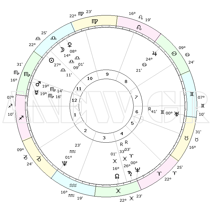 | ΘΕΣΕΙΣ ΠΛΑΝΗΤΩΝ ΑΣΤΡΟΛΟΓΙΚΟΥ ΧΑΡΤΗ ΤΗΣ ΣΤΙΓΜΗΣ ΑΥΤΗΣ | | Πλανήτης | Ζώδιο | Μοίρες | Δεκαήμ. | Σε οίκο | Απόκλιση | | Ακμές των οίκων | Ηλιος | Ζυγός | 27°04' | Τρίτο | 12 | 10 S 25 | | 1ος | 29°59' | Ζυγός | Σελήνη | Ζυγός | 12°37' | Δεύτερο | 12 | 06 S 58 | | 2ος | 28°24' | Σκορπιός | Ερμής | Σκορπιός | 19°06' | Δεύτερο | 1 | 19 S 39 | | 3ος | 00°21' | Αιγόκερως | Αφροδίτη | Ζυγός | 07°52' | Πρώτο | 12 | 01 S 42 | | 4ος | 04°32' | Υδροχόος | Αρης | Σκορπιός | 19°09' | Δεύτερο | 1 | 17 S 46 | | 5ος | 07°27' | Ιχθείς | Δίας | Καρκίνος | 24°20' | Τρίτο | 9 | 21 N 18 | | 6ος | 06°08' | Κριός | Κρόνος | Ιχθείς | 26°33'R | Τρίτο | 5 | 03 S 39 | | 7ος | 29°59' | Κριός | Ουρανός | Δίδυμοι | 00°42'R | Πρώτο | 8 | 20 N 05 | | 8ος | 28°24' | Ταύρος | Ποσειδώνας | Κριός | 00°03'R | Πρώτο | 5 | 01 S 14 | | 9ος | 00°21' | Καρκίνος | Πλούτωνας | Υδροχόος | 01°23' | Πρώτο | 3 | 23 S 32 | | 10ος | 04°32' | Λέων | Β. Δεσμός | Ιχθείς | 16°01' | Δεύτερο | 5 | 05 S 31 | | 11ος | 07°27' | Παρθένος | Ωροσκόπος | Ζυγός | 29°59' | Τρίτο | | | 12ος | 06°08' | Ζυγός | Μεσουράνημα | Λέων | 04°32' | Πρώτο | | | |