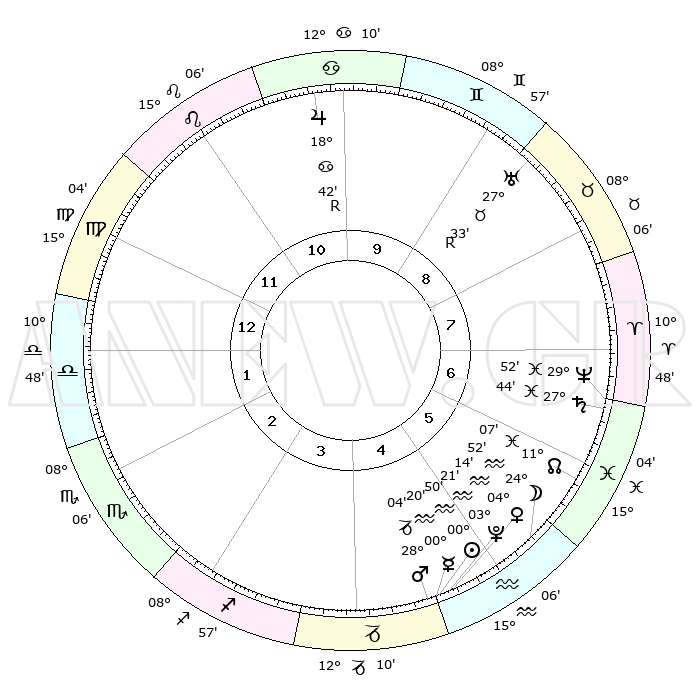| | ΘΕΣΕΙΣ ΠΛΑΝΗΤΩΝ ΑΣΤΡΟΛΟΓΙΚΟΥ ΧΑΡΤΗ ΤΗΣ ΣΤΙΓΜΗΣ ΑΥΤΗΣ | | | | Πλανήτης | Ζώδιο | Μοίρες | Δεκαήμ. | Σε οίκο | Απόκλιση | | Ακμές των οίκων | | Ηλιος | Υδροχόος | 00°44' | Πρώτο | 5 | 19 S 59 | | 1ος | 11°45' | Παρθένος | | Σελήνη | Υδροχόος | 23°36' | Τρίτο | 6 | 14 S 59 | | 2ος | 06°48' | Ζυγός | | Ερμής | Υδροχόος | 00°10' | Πρώτο | 5 | 22 S 06 | | 3ος | 06°22' | Σκορπιός | | Αφροδίτη | Υδροχόος | 04°06' | Πρώτο | 5 | 20 S 20 | | 4ος | 09°19' | Τοξότης | | Αρης | Αιγόκερως | 27°59' | Τρίτο | 5 | 21 S 32 | | 5ος | 12°49' | Αιγόκερως | | Δίας | Καρκίνος | 18°43'R | Δεύτερο | 11 | 22 N 24 | | 6ος | 14°01' | Υδροχόος | | Κρόνος | Ιχθείς | 27°43' | Τρίτο | 7 | 02 S 56 | | 7ος | 11°45' | Ιχθείς | | Ουρανός | Ταύρος | 27°33'R | Τρίτο | 9 | 19 N 25 | | 8ος | 06°48' | Κριός | | Ποσειδώνας | Ιχθείς | 29°52' | Τρίτο | 7 | 01 S 16 | | 9ος | 06°22' | Ταύρος | | Πλούτωνας | Υδροχόος | 03°21' | Πρώτο | 5 | 23 S 06 | | 10ος | 09°19' | Δίδυμοι | | Β. Δεσμός | Ιχθείς | 11°07' | Δεύτερο | 6 | 07 S 24 | | 11ος | 12°49' | Καρκίνος | | Ωροσκόπος | Παρθένος | 11°45' | Δεύτερο | | | 12ος | 14°01' | Λέων | | Μεσουράνημα | Δίδυμοι | 09°19' | Πρώτο | | | |