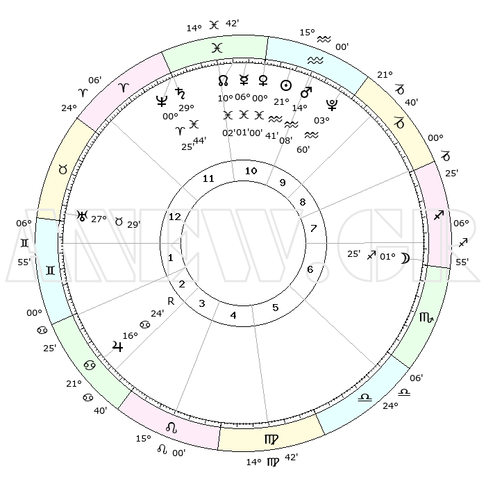 | | ΘΕΣΕΙΣ ΠΛΑΝΗΤΩΝ ΑΣΤΡΟΛΟΓΙΚΟΥ ΧΑΡΤΗ ΤΗΣ ΣΤΙΓΜΗΣ ΑΥΤΗΣ | | | | Πλανήτης | Ζώδιο | Μοίρες | Δεκαήμ. | Σε οίκο | Απόκλιση | | Ακμές των οίκων | | Ηλιος | Υδροχόος | 21°37' | Τρίτο | 11 | 14 S 18 | | 1ος | 09°23' | Ταύρος | | Σελήνη | Τοξότης | 00°41' | Πρώτο | 7 | 25 S 22 | | 2ος | 09°04' | Δίδυμοι | | Ερμής | Ιχθείς | 05°54' | Πρώτο | 11 | 10 S 08 | | 3ος | 01°45' | Καρκίνος | | Αφροδίτη | Υδροχόος | 29°56' | Τρίτο | 11 | 12 S 51 | | 4ος | 23°33' | Καρκίνος | | Αρης | Υδροχόος | 14°05' | Δεύτερο | 10 | 17 S 37 | | 5ος | 18°59' | Λέων | | Δίας | Καρκίνος | 16°25'R | Δεύτερο | 3 | 22 N 45 | | 6ος | 23°34' | Παρθένος | | Κρόνος | Ιχθείς | 29°43' | Τρίτο | 12 | 02 S 05 | | 7ος | 09°23' | Σκορπιός | | Ουρανός | Ταύρος | 27°29' | Τρίτο | 1 | 19 N 25 | | 8ος | 09°04' | Τοξότης | | Ποσειδώνας | Κριός | 00°25' | Πρώτο | 12 | 01 S 02 | | 9ος | 01°45' | Αιγόκερως | | Πλούτωνας | Υδροχόος | 03°60' | Πρώτο | 10 | 22 S 58 | | 10ος | 23°33' | Αιγόκερως | | Β. Δεσμός | Ιχθείς | 10°02' | Δεύτερο | 11 | 07 S 48 | | 11ος | 18°59' | Υδροχόος | | Ωροσκόπος | Ταύρος | 09°23' | Πρώτο | | | 12ος | 23°34' | Ιχθείς | | Μεσουράνημα | Αιγόκερως | 23°33' | Τρίτο | | | |