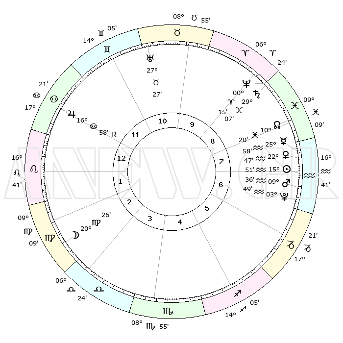 | | ΘΕΣΕΙΣ ΠΛΑΝΗΤΩΝ ΑΣΤΡΟΛΟΓΙΚΟΥ ΧΑΡΤΗ ΤΗΣ ΣΤΙΓΜΗΣ ΑΥΤΗΣ | | | | Πλανήτης | Ζώδιο | Μοίρες | Δεκαήμ. | Σε οίκο | Απόκλιση | | Ακμές των οίκων | | Ηλιος | Υδροχόος | 15°46' | Δεύτερο | 8 | 16 S 06 | | 1ος | 24°27' | Καρκίνος | | Σελήνη | Παρθένος | 19°26' | Δεύτερο | 3 | 03 N 19 | | 2ος | 15°10' | Λέων | | Ερμής | Υδροχόος | 25°50' | Τρίτο | 8 | 14 S 25 | | 3ος | 09°28' | Παρθένος | | Αφροδίτη | Υδροχόος | 22°41' | Τρίτο | 8 | 15 S 17 | | 4ος | 09°45' | Ζυγός | | Αρης | Υδροχόος | 09°33' | Πρώτο | 7 | 18 S 52 | | 5ος | 15°50' | Σκορπιός | | Δίας | Καρκίνος | 16°58'R | Δεύτερο | 12 | 22 N 40 | | 6ος | 22°29' | Τοξότης | | Κρόνος | Ιχθείς | 29°07' | Τρίτο | 9 | 02 S 20 | | 7ος | 24°27' | Αιγόκερως | | Ουρανός | Ταύρος | 27°27' | Τρίτο | 11 | 19 N 24 | | 8ος | 15°10' | Υδροχόος | | Ποσειδώνας | Κριός | 00°15' | Πρώτο | 9 | 01 S 06 | | 9ος | 09°28' | Ιχθείς | | Πλούτωνας | Υδροχόος | 03°49' | Πρώτο | 7 | 23 S 00 | | 10ος | 09°45' | Κριός | | Β. Δεσμός | Ιχθείς | 10°20' | Δεύτερο | 9 | 07 S 41 | | 11ος | 15°50' | Ταύρος | | Ωροσκόπος | Καρκίνος | 24°27' | Τρίτο | | | 12ος | 22°29' | Δίδυμοι | | Μεσουράνημα | Κριός | 09°45' | Πρώτο | | | |