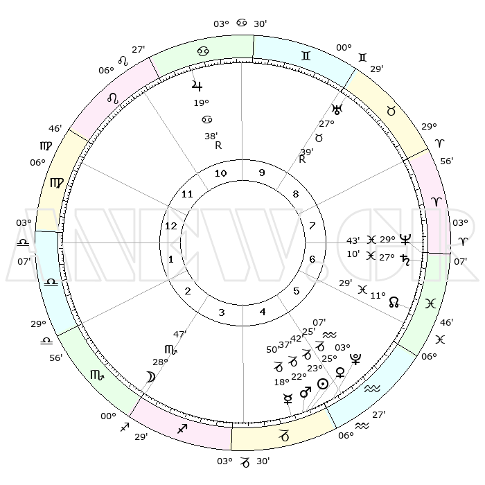 | | ΘΕΣΕΙΣ ΠΛΑΝΗΤΩΝ ΑΣΤΡΟΛΟΓΙΚΟΥ ΧΑΡΤΗ ΤΗΣ ΣΤΙΓΜΗΣ ΑΥΤΗΣ | | | | Πλανήτης | Ζώδιο | Μοίρες | Δεκαήμ. | Σε οίκο | Απόκλιση | | Ακμές των οίκων | | Ηλιος | Αιγόκερως | 23°37' | Τρίτο | 5 | 21 S 22 | | 1ος | 09°49' | Παρθένος | | Σελήνη | Σκορπιός | 27°51' | Τρίτο | 3 | 24 S 33 | | 2ος | 04°40' | Ζυγός | | Ερμής | Αιγόκερως | 18°42' | Δεύτερο | 5 | 23 S 49 | | 3ος | 04°07' | Σκορπιός | | Αφροδίτη | Αιγόκερως | 25°19' | Τρίτο | 5 | 22 S 00 | | 4ος | 07°04' | Τοξότης | | Αρης | Αιγόκερως | 22°34' | Τρίτο | 5 | 22 S 30 | | 5ος | 10°40' | Αιγόκερως | | Δίας | Καρκίνος | 19°38'R | Δεύτερο | 11 | 22 N 16 | | 6ος | 11°58' | Υδροχόος | | Κρόνος | Ιχθείς | 27°09' | Τρίτο | 7 | 03 S 10 | | 7ος | 09°49' | Ιχθείς | | Ουρανός | Ταύρος | 27°39'R | Τρίτο | 9 | 19 N 27 | | 8ος | 04°40' | Κριός | | Ποσειδώνας | Ιχθείς | 29°43' | Τρίτο | 7 | 01 S 20 | | 9ος | 04°07' | Ταύρος | | Πλούτωνας | Υδροχόος | 03°07' | Πρώτο | 5 | 23 S 08 | | 10ος | 07°04' | Δίδυμοι | | Β. Δεσμός | Ιχθείς | 11°29' | Δεύτερο | 7 | 07 S 15 | | 11ος | 10°40' | Καρκίνος | | Ωροσκόπος | Παρθένος | 09°49' | Πρώτο | | | 12ος | 11°58' | Λέων | | Μεσουράνημα | Δίδυμοι | 07°04' | Πρώτο | | | |