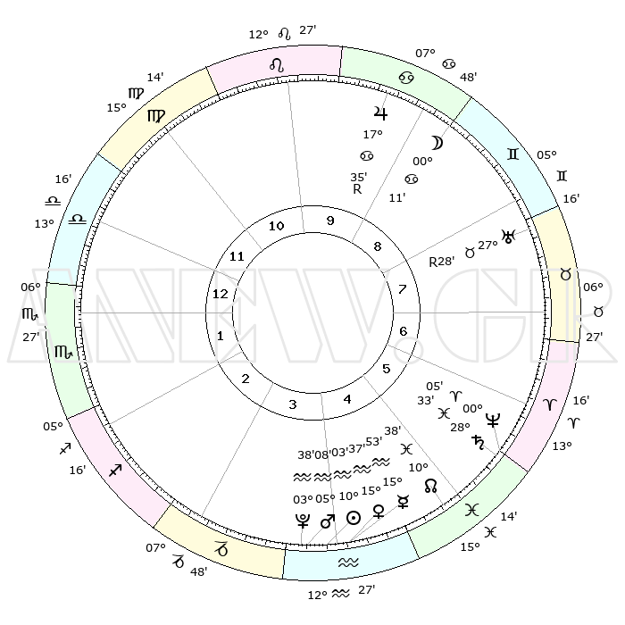 | | ΘΕΣΕΙΣ ΠΛΑΝΗΤΩΝ ΑΣΤΡΟΛΟΓΙΚΟΥ ΧΑΡΤΗ ΤΗΣ ΣΤΙΓΜΗΣ ΑΥΤΗΣ | | | | Πλανήτης | Ζώδιο | Μοίρες | Δεκαήμ. | Σε οίκο | Απόκλιση | | Ακμές των οίκων | | Ηλιος | Υδροχόος | 09°59' | Πρώτο | 4 | 17 S 44 | | 1ος | 20°16' | Ζυγός | | Σελήνη | Δίδυμοι | 29°22' | Τρίτο | 9 | 28 N 19 | | 2ος | 18°07' | Σκορπιός | | Ερμής | Υδροχόος | 15°47' | Δεύτερο | 4 | 18 S 00 | | 3ος | 19°25' | Τοξότης | | Αφροδίτη | Υδροχόος | 15°33' | Δεύτερο | 4 | 17 S 26 | | 4ος | 23°01' | Αιγόκερως | | Αρης | Υδροχόος | 05°05' | Πρώτο | 4 | 20 S 00 | | 5ος | 25°59' | Υδροχόος | | Δίας | Καρκίνος | 17°36'R | Δεύτερο | 9 | 22 N 35 | | 6ος | 25°25' | Ιχθείς | | Κρόνος | Ιχθείς | 28°33' | Τρίτο | 6 | 02 S 35 | | 7ος | 20°16' | Κριός | | Ουρανός | Ταύρος | 27°28'R | Τρίτο | 8 | 19 N 24 | | 8ος | 18°07' | Ταύρος | | Ποσειδώνας | Κριός | 00°05' | Πρώτο | 6 | 01 S 10 | | 9ος | 19°25' | Δίδυμοι | | Πλούτωνας | Υδροχόος | 03°38' | Πρώτο | 4 | 23 S 02 | | 10ος | 23°01' | Καρκίνος | | Β. Δεσμός | Ιχθείς | 10°38' | Δεύτερο | 5 | 07 S 35 | | 11ος | 25°58' | Λέων | | Ωροσκόπος | Ζυγός | 20°16' | Τρίτο | | | 12ος | 25°25' | Παρθένος | | Μεσουράνημα | Καρκίνος | 23°01' | Τρίτο | | | |