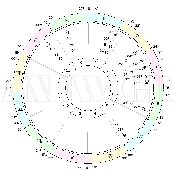 | | ΘΕΣΕΙΣ ΠΛΑΝΗΤΩΝ ΑΣΤΡΟΛΟΓΙΚΟΥ ΧΑΡΤΗ ΤΗΣ ΣΤΙΓΜΗΣ ΑΥΤΗΣ | | | | Πλανήτης | Ζώδιο | Μοίρες | Δεκαήμ. | Σε οίκο | Απόκλιση | | Ακμές των οίκων | | Ηλιος | Ταύρος | 04°21' | Πρώτο | 9 | 12 N 58 | | 1ος | 08°13' | Παρθένος | | Σελήνη | Λέων | 09°36' | Πρώτο | 11 | 20 N 08 | | 2ος | 02°54' | Ζυγός | | Ερμής | Κριός | 14°30' | Δεύτερο | 8 | 03 N 27 | | 3ος | 02°14' | Σκορπιός | | Αφροδίτη | Δίδυμοι | 00°26' | Πρώτο | 9 | 20 N 50 | | 4ος | 05°12' | Τοξότης | | Αρης | Κριός | 11°24' | Δεύτερο | 8 | 03 N 39 | | 5ος | 08°53' | Αιγόκερως | | Δίας | Καρκίνος | 18°03' | Δεύτερο | 11 | 22 N 36 | | 6ος | 10°16' | Υδροχόος | | Κρόνος | Κριός | 08°31' | Πρώτο | 8 | 01 N 23 | | 7ος | 08°13' | Ιχθείς | | Ουρανός | Ταύρος | 29°55' | Τρίτο | 9 | 19 N 58 | | 8ος | 02°54' | Κριός | | Ποσειδώνας | Κριός | 03°03' | Πρώτο | 8 | 00 N 00 | | 9ος | 02°14' | Ταύρος | | Πλούτωνας | Υδροχόος | 05°28' | Πρώτο | 5 | 22 S 48 | | 10ος | 05°12' | Δίδυμοι | | Β. Δεσμός | Ιχθείς | 06°09' | Πρώτο | 6 | 09 S 15 | | 11ος | 08°53' | Καρκίνος | | Ωροσκόπος | Παρθένος | 08°13' | Πρώτο | | | 12ος | 10°16' | Λέων | | Μεσουράνημα | Δίδυμοι | 05°12' | Πρώτο | | | |