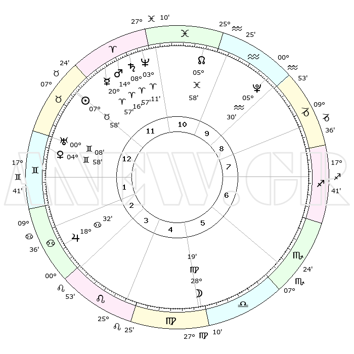 | | ΘΕΣΕΙΣ ΠΛΑΝΗΤΩΝ ΑΣΤΡΟΛΟΓΙΚΟΥ ΧΑΡΤΗ ΤΗΣ ΣΤΙΓΜΗΣ ΑΥΤΗΣ | | | | Πλανήτης | Ζώδιο | Μοίρες | Δεκαήμ. | Σε οίκο | Απόκλιση | | Ακμές των οίκων | | Ηλιος | Ταύρος | 07°55' | Πρώτο | 12 | 14 N 09 | | 1ος | 22°19' | Ταύρος | | Σελήνη | Παρθένος | 27°32' | Τρίτο | 5 | 00 S 38 | | 2ος | 18°47' | Δίδυμοι | | Ερμής | Κριός | 20°51' | Τρίτο | 12 | 06 N 06 | | 3ος | 10°33' | Καρκίνος | | Αφροδίτη | Δίδυμοι | 04°53' | Πρώτο | 1 | 21 N 52 | | 4ος | 02°50' | Λέων | | Αρης | Κριός | 14°13' | Δεύτερο | 12 | 04 N 46 | | 5ος | 00°03' | Παρθένος | | Δίας | Καρκίνος | 18°32' | Δεύτερο | 3 | 22 N 32 | | 6ος | 07°10' | Ζυγός | | Κρόνος | Κριός | 08°56' | Πρώτο | 12 | 01 N 33 | | 7ος | 22°19' | Σκορπιός | | Ουρανός | Δίδυμοι | 00°07' | Πρώτο | 1 | 20 N 01 | | 8ος | 18°47' | Τοξότης | | Ποσειδώνας | Κριός | 03°10' | Πρώτο | 11 | 00 N 03 | | 9ος | 10°33' | Αιγόκερως | | Πλούτωνας | Υδροχόος | 05°30' | Πρώτο | 10 | 22 S 48 | | 10ος | 02°50' | Υδροχόος | | Β. Δεσμός | Ιχθείς | 05°58' | Πρώτο | 11 | 09 S 19 | | 11ος | 00°03' | Ιχθείς | | Ωροσκόπος | Ταύρος | 22°19' | Τρίτο | | | 12ος | 07°10' | Κριός | | Μεσουράνημα | Υδροχόος | 02°50' | Πρώτο | | | |