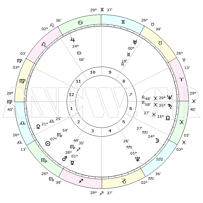 | | ΘΕΣΕΙΣ ΠΛΑΝΗΤΩΝ ΑΣΤΡΟΛΟΓΙΚΟΥ ΧΑΡΤΗ ΤΗΣ ΣΤΙΓΜΗΣ ΑΥΤΗΣ | | | | Πλανήτης | Ζώδιο | Μοίρες | Δεκαήμ. | Σε οίκο | Απόκλιση | | Ακμές των οίκων | | Ηλιος | Σκορπιός | 07°42' | Πρώτο | 4 | 14 S 05 | | 1ος | 05°45' | Λέων | | Σελήνη | Υδροχόος | 22°01' | Τρίτο | 7 | 16 S 13 | | 2ος | 27°13' | Λέων | | Ερμής | Τοξότης | 01°24' | Πρώτο | 5 | 23 S 16 | | 3ος | 23°03' | Παρθένος | | Αφροδίτη | Ζυγός | 21°11' | Τρίτο | 3 | 06 S 53 | | 4ος | 24°43' | Ζυγός | | Αρης | Σκορπιός | 26°41' | Τρίτο | 4 | 19 S 47 | | 5ος | 00°34' | Τοξότης | | Δίας | Καρκίνος | 24°55' | Τρίτο | 12 | 21 N 13 | | 6ος | 05°21' | Αιγόκερως | | Κρόνος | Ιχθείς | 25°59'R | Τρίτο | 9 | 03 S 52 | | 7ος | 05°45' | Υδροχόος | | Ουρανός | Δίδυμοι | 00°19'R | Πρώτο | 10 | 20 N 00 | | 8ος | 27°13' | Υδροχόος | | Ποσειδώνας | Ιχθείς | 29°49'R | Τρίτο | 9 | 01 S 20 | | 9ος | 23°03' | Ιχθείς | | Πλούτωνας | Υδροχόος | 01°26' | Πρώτο | 6 | 23 S 31 | | 10ος | 24°43' | Κριός | | Β. Δεσμός | Ιχθείς | 15°27' | Δεύτερο | 8 | 05 S 44 | | 11ος | 00°34' | Δίδυμοι | | Ωροσκόπος | Λέων | 05°45' | Πρώτο | | | 12ος | 05°21' | Καρκίνος | | Μεσουράνημα | Κριός | 24°43' | Τρίτο | | | |