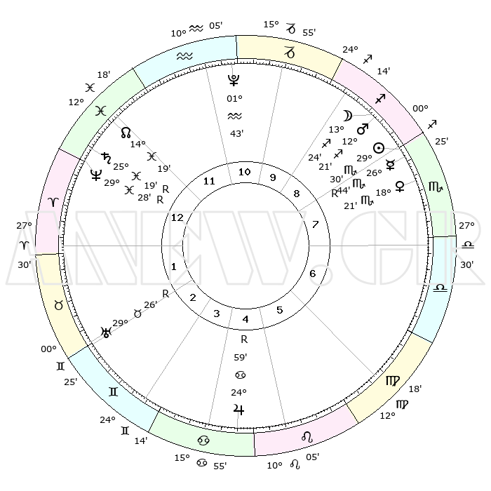 | | ΘΕΣΕΙΣ ΠΛΑΝΗΤΩΝ ΑΣΤΡΟΛΟΓΙΚΟΥ ΧΑΡΤΗ ΤΗΣ ΣΤΙΓΜΗΣ ΑΥΤΗΣ | | | | Πλανήτης | Ζώδιο | Μοίρες | Δεκαήμ. | Σε οίκο | Απόκλιση | | Ακμές των οίκων | | Ηλιος | Σκορπιός | 29°27' | Τρίτο | 8 | 20 S 02 | | 1ος | 04°27' | Κριός | | Σελήνη | Τοξότης | 12°55' | Δεύτερο | 9 | 27 S 18 | | 2ος | 13°38' | Ταύρος | | Ερμής | Σκορπιός | 26°47'R | Τρίτο | 8 | 18 S 32 | | 3ος | 10°23' | Δίδυμοι | | Αφροδίτη | Σκορπιός | 18°18' | Δεύτερο | 8 | 16 S 17 | | 4ος | 02°30' | Καρκίνος | | Αρης | Τοξότης | 12°19' | Δεύτερο | 9 | 22 S 51 | | 5ος | 25°01' | Καρκίνος | | Δίας | Καρκίνος | 24°59'R | Τρίτο | 4 | 21 N 16 | | 6ος | 23°07' | Λέων | | Κρόνος | Ιχθείς | 25°19'R | Τρίτο | 12 | 04 S 04 | | 7ος | 04°27' | Ζυγός | | Ουρανός | Ταύρος | 29°26'R | Τρίτο | 2 | 19 N 49 | | 8ος | 13°38' | Σκορπιός | | Ποσειδώνας | Ιχθείς | 29°28'R | Τρίτο | 12 | 01 S 27 | | 9ος | 10°23' | Τοξότης | | Πλούτωνας | Υδροχόος | 01°43' | Πρώτο | 11 | 23 S 27 | | 10ος | 02°30' | Αιγόκερως | | Β. Δεσμός | Ιχθείς | 14°19' | Δεύτερο | 12 | 06 S 10 | | 11ος | 25°01' | Αιγόκερως | | Ωροσκόπος | Κριός | 04°27' | Πρώτο | | | 12ος | 23°07' | Υδροχόος | | Μεσουράνημα | Αιγόκερως | 02°30' | Πρώτο | | | |