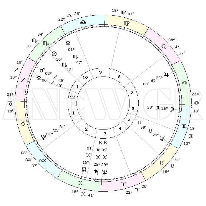 | | ΘΕΣΕΙΣ ΠΛΑΝΗΤΩΝ ΑΣΤΡΟΛΟΓΙΚΟΥ ΧΑΡΤΗ ΤΗΣ ΣΤΙΓΜΗΣ ΑΥΤΗΣ | | | | Πλανήτης | Ζώδιο | Μοίρες | Δεκαήμ. | Σε οίκο | Απόκλιση | | Ακμές των οίκων | | Ηλιος | Σκορπιός | 15°59' | Δεύτερο | 1 | 16 S 37 | | 1ος | 00°32' | Σκορπιός | | Σελήνη | Δίδυμοι | 22°57' | Τρίτο | 8 | 28 N 17 | | 2ος | 28°58' | Σκορπιός | | Ερμής | Τοξότης | 06°40' | Πρώτο | 2 | 23 S 57 | | 3ος | 00°58' | Αιγόκερως | | Αφροδίτη | Σκορπιός | 01°32' | Πρώτο | 1 | 10 S 44 | | 4ος | 05°12' | Υδροχόος | | Αρης | Τοξότης | 02°36' | Πρώτο | 2 | 21 S 08 | | 5ος | 08°06' | Ιχθείς | | Δίας | Καρκίνος | 25°08' | Τρίτο | 9 | 21 N 12 | | 6ος | 06°44' | Κριός | | Κρόνος | Ιχθείς | 25°38'R | Τρίτο | 5 | 03 S 59 | | 7ος | 00°32' | Ταύρος | | Ουρανός | Ταύρος | 29°60'R | Τρίτο | 8 | 19 N 56 | | 8ος | 28°58' | Ταύρος | | Ποσειδώνας | Ιχθείς | 29°39'R | Τρίτο | 5 | 01 S 23 | | 9ος | 00°58' | Καρκίνος | | Πλούτωνας | Υδροχόος | 01°31' | Πρώτο | 3 | 23 S 30 | | 10ος | 05°12' | Λέων | | Β. Δεσμός | Ιχθείς | 15°01' | Δεύτερο | 5 | 05 S 54 | | 11ος | 08°06' | Παρθένος | | Ωροσκόπος | Σκορπιός | 00°32' | Πρώτο | | | 12ος | 06°44' | Ζυγός | | Μεσουράνημα | Λέων | 05°12' | Πρώτο | | | |