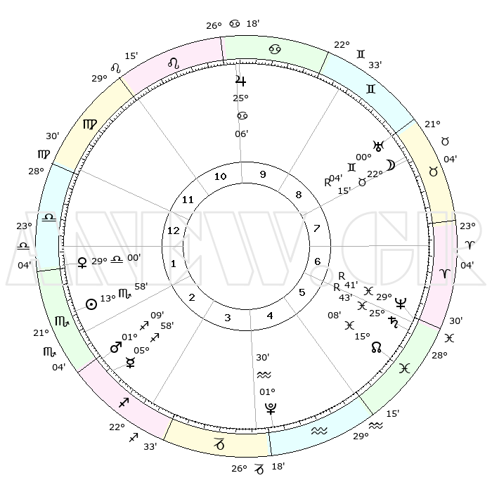 | | ΘΕΣΕΙΣ ΠΛΑΝΗΤΩΝ ΑΣΤΡΟΛΟΓΙΚΟΥ ΧΑΡΤΗ ΤΗΣ ΣΤΙΓΜΗΣ ΑΥΤΗΣ | | | | Πλανήτης | Ζώδιο | Μοίρες | Δεκαήμ. | Σε οίκο | Απόκλιση | | Ακμές των οίκων | | Ηλιος | Σκορπιός | 13°49' | Δεύτερο | 3 | 15 S 59 | | 1ος | 08°56' | Παρθένος | | Σελήνη | Ταύρος | 19°57' | Δεύτερο | 9 | 22 N 05 | | 2ος | 03°43' | Ζυγός | | Ερμής | Τοξότης | 05°54' | Πρώτο | 3 | 24 S 00 | | 3ος | 03°06' | Σκορπιός | | Αφροδίτη | Ζυγός | 28°49' | Τρίτο | 2 | 09 S 44 | | 4ος | 06°03' | Τοξότης | | Αρης | Τοξότης | 01°03' | Πρώτο | 3 | 20 S 48 | | 5ος | 09°41' | Αιγόκερως | | Δίας | Καρκίνος | 25°06' | Τρίτο | 11 | 21 N 12 | | 6ος | 11°03' | Υδροχόος | | Κρόνος | Ιχθείς | 25°43'R | Τρίτο | 7 | 03 S 57 | | 7ος | 08°56' | Ιχθείς | | Ουρανός | Δίδυμοι | 00°05'R | Πρώτο | 9 | 19 N 57 | | 8ος | 03°43' | Κριός | | Ποσειδώνας | Ιχθείς | 29°42'R | Τρίτο | 7 | 01 S 23 | | 9ος | 03°06' | Ταύρος | | Πλούτωνας | Υδροχόος | 01°30' | Πρώτο | 5 | 23 S 30 | | 10ος | 06°03' | Δίδυμοι | | Β. Δεσμός | Ιχθείς | 15°08' | Δεύτερο | 7 | 05 S 51 | | 11ος | 09°41' | Καρκίνος | | Ωροσκόπος | Παρθένος | 08°56' | Πρώτο | | | 12ος | 11°03' | Λέων | | Μεσουράνημα | Δίδυμοι | 06°03' | Πρώτο | | | |
