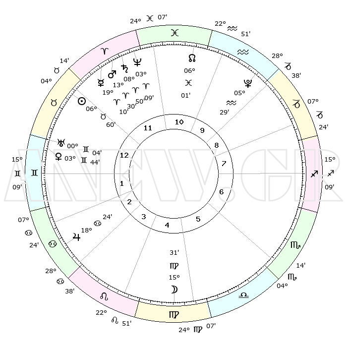 | | ΘΕΣΕΙΣ ΠΛΑΝΗΤΩΝ ΑΣΤΡΟΛΟΓΙΚΟΥ ΧΑΡΤΗ ΤΗΣ ΣΤΙΓΜΗΣ ΑΥΤΗΣ | | | | Πλανήτης | Ζώδιο | Μοίρες | Δεκαήμ. | Σε οίκο | Απόκλιση | | Ακμές των οίκων | | Ηλιος | Ταύρος | 06°57' | Πρώτο | 12 | 13 N 50 | | 1ος | 23°36' | Ταύρος | | Σελήνη | Παρθένος | 14°51' | Δεύτερο | 5 | 05 N 21 | | 2ος | 19°47' | Δίδυμοι | | Ερμής | Κριός | 19°05' | Δεύτερο | 12 | 05 N 21 | | 3ος | 11°29' | Καρκίνος | | Αφροδίτη | Δίδυμοι | 03°41' | Πρώτο | 1 | 21 N 36 | | 4ος | 03°50' | Λέων | | Αρης | Κριός | 13°27' | Δεύτερο | 12 | 04 N 28 | | 5ος | 01°14' | Παρθένος | | Δίας | Καρκίνος | 18°24' | Δεύτερο | 3 | 22 N 33 | | 6ος | 08°35' | Ζυγός | | Κρόνος | Κριός | 08°50' | Πρώτο | 12 | 01 N 30 | | 7ος | 23°36' | Σκορπιός | | Ουρανός | Δίδυμοι | 00°04' | Πρώτο | 1 | 20 N 00 | | 8ος | 19°47' | Τοξότης | | Ποσειδώνας | Κριός | 03°08' | Πρώτο | 11 | 00 N 02 | | 9ος | 11°29' | Αιγόκερως | | Πλούτωνας | Υδροχόος | 05°29' | Πρώτο | 10 | 22 S 48 | | 10ος | 03°49' | Υδροχόος | | Β. Δεσμός | Ιχθείς | 06°01' | Πρώτο | 11 | 09 S 18 | | 11ος | 01°14' | Ιχθείς | | Ωροσκόπος | Ταύρος | 23°36' | Τρίτο | | | 12ος | 08°35' | Κριός | | Μεσουράνημα | Υδροχόος | 03°49' | Πρώτο | | | |