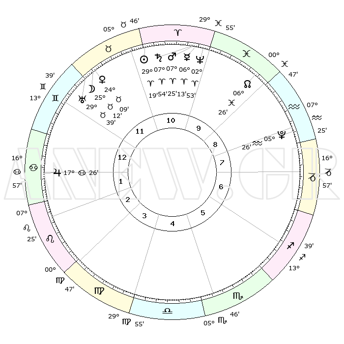 | | ΘΕΣΕΙΣ ΠΛΑΝΗΤΩΝ ΑΣΤΡΟΛΟΓΙΚΟΥ ΧΑΡΤΗ ΤΗΣ ΣΤΙΓΜΗΣ ΑΥΤΗΣ | | | | Πλανήτης | Ζώδιο | Μοίρες | Δεκαήμ. | Σε οίκο | Απόκλιση | | Ακμές των οίκων | | Ηλιος | Κριός | 29°15' | Τρίτο | 11 | 11 N 12 | | 1ος | 26°22' | Δίδυμοι | | Σελήνη | Ταύρος | 24°14' | Τρίτο | 12 | 23 N 38 | | 2ος | 17°25' | Καρκίνος | | Ερμής | Κριός | 06°07' | Πρώτο | 10 | 00 N 01 | | 3ος | 09°00' | Λέων | | Αφροδίτη | Ταύρος | 24°04' | Τρίτο | 12 | 19 N 09 | | 4ος | 04°46' | Παρθένος | | Αρης | Κριός | 07°22' | Πρώτο | 10 | 02 N 02 | | 5ος | 08°06' | Ζυγός | | Δίας | Καρκίνος | 17°26' | Δεύτερο | 2 | 22 N 41 | | 6ος | 18°18' | Σκορπιός | | Κρόνος | Κριός | 07°54' | Πρώτο | 10 | 01 N 09 | | 7ος | 26°22' | Τοξότης | | Ουρανός | Ταύρος | 29°39' | Τρίτο | 12 | 19 N 54 | | 8ος | 17°25' | Αιγόκερως | | Ποσειδώνας | Κριός | 02°53' | Πρώτο | 10 | 00 S 04 | | 9ος | 09°00' | Υδροχόος | | Πλούτωνας | Υδροχόος | 05°26' | Πρώτο | 8 | 22 S 48 | | 10ος | 04°46' | Ιχθείς | | Β. Δεσμός | Ιχθείς | 06°26' | Πρώτο | 10 | 09 S 09 | | 11ος | 08°06' | Κριός | | Ωροσκόπος | Δίδυμοι | 26°22' | Τρίτο | | | 12ος | 18°18' | Ταύρος | | Μεσουράνημα | Ιχθείς | 04°46' | Πρώτο | | | |