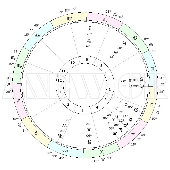| | ΘΕΣΕΙΣ ΠΛΑΝΗΤΩΝ ΑΣΤΡΟΛΟΓΙΚΟΥ ΧΑΡΤΗ ΤΗΣ ΣΤΙΓΜΗΣ ΑΥΤΗΣ | | | | Πλανήτης | Ζώδιο | Μοίρες | Δεκαήμ. | Σε οίκο | Απόκλιση | | Ακμές των οίκων | | Ηλιος | Ταύρος | 05°31' | Πρώτο | 6 | 13 N 22 | | 1ος | 09°54' | Σκορπιός | | Σελήνη | Λέων | 25°48' | Τρίτο | 10 | 13 N 53 | | 2ος | 08°58' | Τοξότης | | Ερμής | Κριός | 16°33' | Δεύτερο | 5 | 04 N 18 | | 3ος | 11°51' | Αιγόκερως | | Αφροδίτη | Δίδυμοι | 01°54' | Πρώτο | 7 | 21 N 11 | | 4ος | 16°45' | Υδροχόος | | Αρης | Κριός | 12°20' | Δεύτερο | 5 | 04 N 01 | | 5ος | 19°25' | Ιχθείς | | Δίας | Καρκίνος | 18°13' | Δεύτερο | 9 | 22 N 35 | | 6ος | 17°05' | Κριός | | Κρόνος | Κριός | 08°39' | Πρώτο | 5 | 01 N 27 | | 7ος | 09°54' | Ταύρος | | Ουρανός | Ταύρος | 29°59' | Τρίτο | 7 | 19 N 59 | | 8ος | 08°58' | Δίδυμοι | | Ποσειδώνας | Κριός | 03°06' | Πρώτο | 5 | 00 N 01 | | 9ος | 11°51' | Καρκίνος | | Πλούτωνας | Υδροχόος | 05°29' | Πρώτο | 3 | 22 S 48 | | 10ος | 16°45' | Λέων | | Β. Δεσμός | Ιχθείς | 06°06' | Πρώτο | 4 | 09 S 16 | | 11ος | 19°25' | Παρθένος | | Ωροσκόπος | Σκορπιός | 09°54' | Πρώτο | | | 12ος | 17°05' | Ζυγός | | Μεσουράνημα | Λέων | 16°45' | Δεύτερο | | | |