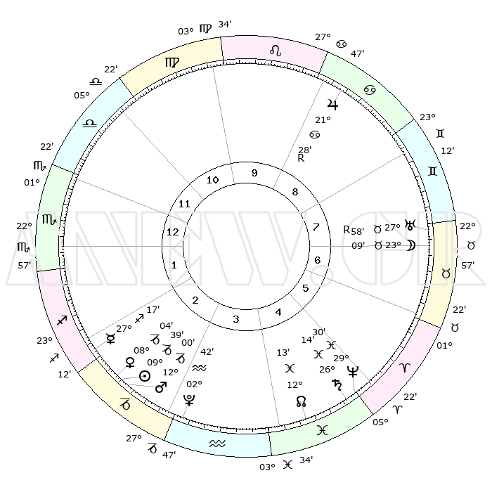 | | ΘΕΣΕΙΣ ΠΛΑΝΗΤΩΝ ΑΣΤΡΟΛΟΓΙΚΟΥ ΧΑΡΤΗ ΤΗΣ ΣΤΙΓΜΗΣ ΑΥΤΗΣ | | | | Πλανήτης | Ζώδιο | Μοίρες | Δεκαήμ. | Σε οίκο | Απόκλιση | | Ακμές των οίκων | | Ηλιος | Αιγόκερως | 09°33' | Πρώτο | 3 | 23 S 05 | | 1ος | 28°23' | Ζυγός | | Σελήνη | Ταύρος | 21°54' | Τρίτο | 7 | 22 N 51 | | 2ος | 26°42' | Σκορπιός | | Ερμής | Τοξότης | 27°09' | Τρίτο | 2 | 23 S 52 | | 3ος | 28°32' | Τοξότης | | Αφροδίτη | Αιγόκερως | 07°58' | Πρώτο | 3 | 23 S 40 | | 4ος | 02°37' | Υδροχόος | | Αρης | Αιγόκερως | 11°56' | Δεύτερο | 3 | 23 S 47 | | 5ος | 05°33' | Ιχθείς | | Δίας | Καρκίνος | 21°29'R | Τρίτο | 9 | 21 N 57 | | 6ος | 04°22' | Κριός | | Κρόνος | Ιχθείς | 26°14' | Τρίτο | 5 | 03 S 35 | | 7ος | 28°23' | Κριός | | Ουρανός | Ταύρος | 27°58'R | Τρίτο | 8 | 19 N 31 | | 8ος | 26°42' | Ταύρος | | Ποσειδώνας | Ιχθείς | 29°30' | Τρίτο | 5 | 01 S 25 | | 9ος | 28°32' | Δίδυμοι | | Πλούτωνας | Υδροχόος | 02°42' | Πρώτο | 4 | 23 S 14 | | 10ος | 02°37' | Λέων | | Β. Δεσμός | Ιχθείς | 12°13' | Δεύτερο | 5 | 06 S 58 | | 11ος | 05°33' | Παρθένος | | Ωροσκόπος | Ζυγός | 28°23' | Τρίτο | | | 12ος | 04°22' | Ζυγός | | Μεσουράνημα | Λέων | 02°37' | Πρώτο | | | |