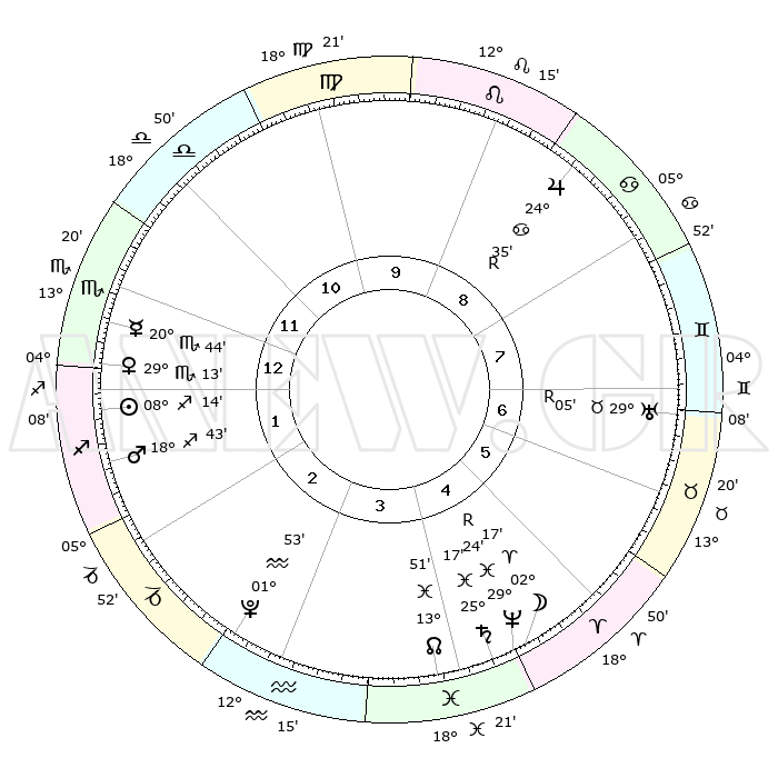| | ΘΕΣΕΙΣ ΠΛΑΝΗΤΩΝ ΑΣΤΡΟΛΟΓΙΚΟΥ ΧΑΡΤΗ ΤΗΣ ΣΤΙΓΜΗΣ ΑΥΤΗΣ | | | | Πλανήτης | Ζώδιο | Μοίρες | Δεκαήμ. | Σε οίκο | Απόκλιση | | Ακμές των οίκων | | Ηλιος | Τοξότης | 08°12' | Πρώτο | 1 | 21 S 40 | | 1ος | 23°46' | Σκορπιός | | Σελήνη | Κριός | 01°48' | Πρώτο | 4 | 02 N 06 | | 2ος | 24°07' | Τοξότης | | Ερμής | Σκορπιός | 20°43' | Τρίτο | 12 | 15 S 27 | | 3ος | 28°50' | Αιγόκερως | | Αφροδίτη | Σκορπιός | 29°10' | Τρίτο | 1 | 19 S 15 | | 4ος | 04°39' | Ιχθείς | | Αρης | Τοξότης | 18°42' | Δεύτερο | 1 | 23 S 36 | | 5ος | 06°23' | Κριός | | Δίας | Καρκίνος | 24°35'R | Τρίτο | 8 | 21 N 21 | | 6ος | 02°16' | Ταύρος | | Κρόνος | Ιχθείς | 25°17' | Τρίτο | 4 | 04 S 03 | | 7ος | 23°46' | Ταύρος | | Ουρανός | Ταύρος | 29°05'R | Τρίτο | 7 | 19 N 45 | | 8ος | 24°07' | Δίδυμοι | | Ποσειδώνας | Ιχθείς | 29°24'R | Τρίτο | 4 | 01 S 29 | | 9ος | 28°50' | Καρκίνος | | Πλούτωνας | Υδροχόος | 01°53' | Πρώτο | 3 | 23 S 24 | | 10ος | 04°39' | Παρθένος | | Β. Δεσμός | Ιχθείς | 13°51' | Δεύτερο | 4 | 06 S 21 | | 11ος | 06°23' | Ζυγός | | Ωροσκόπος | Σκορπιός | 23°46' | Τρίτο | | | 12ος | 02°16' | Σκορπιός | | Μεσουράνημα | Παρθένος | 04°39' | Πρώτο | | | |