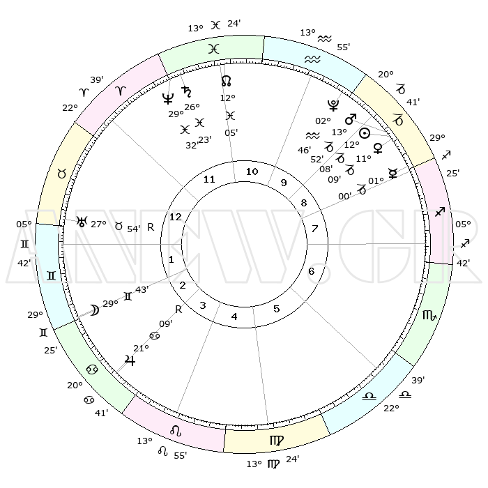| | ΘΕΣΕΙΣ ΠΛΑΝΗΤΩΝ ΑΣΤΡΟΛΟΓΙΚΟΥ ΧΑΡΤΗ ΤΗΣ ΣΤΙΓΜΗΣ ΑΥΤΗΣ | | | | Πλανήτης | Ζώδιο | Μοίρες | Δεκαήμ. | Σε οίκο | Απόκλιση | | Ακμές των οίκων | | Ηλιος | Αιγόκερως | 12°03' | Δεύτερο | 9 | 22 S 53 | | 1ος | 29°26' | Κριός | | Σελήνη | Δίδυμοι | 28°34' | Τρίτο | 3 | 28 N 15 | | 2ος | 01°49' | Δίδυμοι | | Ερμής | Αιγόκερως | 00°53' | Πρώτο | 9 | 24 S 09 | | 3ος | 25°26' | Δίδυμοι | | Αφροδίτη | Αιγόκερως | 11°03' | Δεύτερο | 9 | 23 S 32 | | 4ος | 17°07' | Καρκίνος | | Αρης | Αιγόκερως | 13°49' | Δεύτερο | 9 | 23 S 37 | | 5ος | 11°28' | Λέων | | Δίας | Καρκίνος | 21°10'R | Τρίτο | 4 | 22 N 00 | | 6ος | 14°04' | Παρθένος | | Κρόνος | Ιχθείς | 26°22' | Τρίτο | 12 | 03 S 31 | | 7ος | 29°26' | Ζυγός | | Ουρανός | Ταύρος | 27°54'R | Τρίτο | 1 | 19 N 30 | | 8ος | 01°49' | Τοξότης | | Ποσειδώνας | Ιχθείς | 29°32' | Τρίτο | 12 | 01 S 25 | | 9ος | 25°26' | Τοξότης | | Πλούτωνας | Υδροχόος | 02°46' | Πρώτο | 10 | 23 S 13 | | 10ος | 17°07' | Αιγόκερως | | Β. Δεσμός | Ιχθείς | 12°06' | Δεύτερο | 11 | 07 S 01 | | 11ος | 11°28' | Υδροχόος | | Ωροσκόπος | Κριός | 29°26' | Τρίτο | | | 12ος | 14°04' | Ιχθείς | | Μεσουράνημα | Αιγόκερως | 17°07' | Δεύτερο | | | |