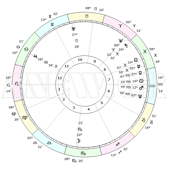 | | ΘΕΣΕΙΣ ΠΛΑΝΗΤΩΝ ΑΣΤΡΟΛΟΓΙΚΟΥ ΧΑΡΤΗ ΤΗΣ ΣΤΙΓΜΗΣ ΑΥΤΗΣ | | | | Πλανήτης | Ζώδιο | Μοίρες | Δεκαήμ. | Σε οίκο | Απόκλιση | | Ακμές των οίκων | | Ηλιος | Υδροχόος | 19°49' | Δεύτερο | 8 | 14 S 52 | | 1ος | 26°38' | Καρκίνος | | Σελήνη | Σκορπιός | 09°26' | Πρώτο | 4 | 18 S 57 | | 2ος | 17°28' | Λέων | | Ερμής | Ιχθείς | 02°52' | Πρώτο | 8 | 11 S 30 | | 3ος | 12°04' | Παρθένος | | Αφροδίτη | Υδροχόος | 27°42' | Τρίτο | 8 | 13 S 38 | | 4ος | 12°40' | Ζυγός | | Αρης | Υδροχόος | 12°41' | Δεύτερο | 7 | 18 S 01 | | 5ος | 18°45' | Σκορπιός | | Δίας | Καρκίνος | 16°34'R | Δεύτερο | 12 | 22 N 43 | | 6ος | 25°01' | Τοξότης | | Κρόνος | Ιχθείς | 29°32' | Τρίτο | 9 | 02 S 10 | | 7ος | 26°38' | Αιγόκερως | | Ουρανός | Ταύρος | 27°28' | Τρίτο | 11 | 19 N 24 | | 8ος | 17°28' | Υδροχόος | | Ποσειδώνας | Κριός | 00°22' | Πρώτο | 9 | 01 S 04 | | 9ος | 12°04' | Ιχθείς | | Πλούτωνας | Υδροχόος | 03°56' | Πρώτο | 7 | 22 S 59 | | 10ος | 12°40' | Κριός | | Β. Δεσμός | Ιχθείς | 10°08' | Δεύτερο | 8 | 07 S 46 | | 11ος | 18°45' | Ταύρος | | Ωροσκόπος | Καρκίνος | 26°38' | Τρίτο | | | 12ος | 25°02' | Δίδυμοι | | Μεσουράνημα | Κριός | 12°40' | Δεύτερο | | | |