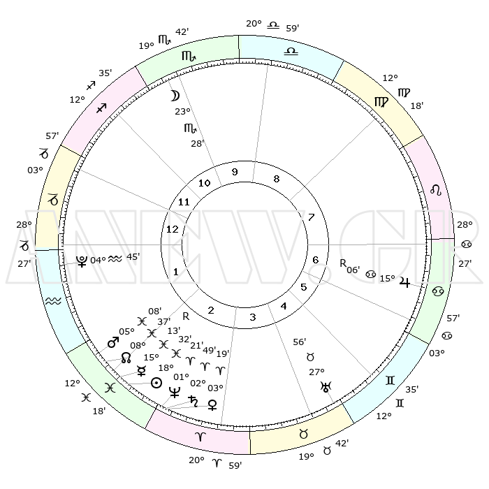 | | ΘΕΣΕΙΣ ΠΛΑΝΗΤΩΝ ΑΣΤΡΟΛΟΓΙΚΟΥ ΧΑΡΤΗ ΤΗΣ ΣΤΙΓΜΗΣ ΑΥΤΗΣ | | | | Πλανήτης | Ζώδιο | Μοίρες | Δεκαήμ. | Σε οίκο | Απόκλιση | | Ακμές των οίκων | | Ηλιος | Ιχθείς | 17°50' | Δεύτερο | 10 | 04 S 48 | | 1ος | 27°03' | Δίδυμοι | | Σελήνη | Σκορπιός | 15°09' | Δεύτερο | 5 | 20 S 59 | | 2ος | 18°02' | Καρκίνος | | Ερμής | Ιχθείς | 15°55'R | Δεύτερο | 10 | 02 S 16 | | 3ος | 09°40' | Λέων | | Αφροδίτη | Κριός | 02°27' | Πρώτο | 10 | 00 S 09 | | 4ος | 05°31' | Παρθένος | | Αρης | Ιχθείς | 04°36' | Πρώτο | 9 | 10 S 51 | | 5ος | 08°58' | Ζυγός | | Δίας | Καρκίνος | 15°06'R | Δεύτερο | 1 | 22 N 56 | | 6ος | 19°09' | Σκορπιός | | Κρόνος | Κριός | 02°44' | Πρώτο | 10 | 00 S 52 | | 7ος | 27°03' | Τοξότης | | Ουρανός | Ταύρος | 27°55' | Τρίτο | 12 | 19 N 31 | | 8ος | 18°02' | Αιγόκερως | | Ποσειδώνας | Κριός | 01°19' | Πρώτο | 10 | 00 S 40 | | 9ος | 09°40' | Υδροχόος | | Πλούτωνας | Υδροχόος | 04°44' | Πρώτο | 8 | 22 S 51 | | 10ος | 05°31' | Ιχθείς | | Β. Δεσμός | Ιχθείς | 08°39' | Πρώτο | 10 | 08 S 19 | | 11ος | 08°58' | Κριός | | Ωροσκόπος | Δίδυμοι | 27°03' | Τρίτο | | | 12ος | 19°09' | Ταύρος | | Μεσουράνημα | Ιχθείς | 05°31' | Πρώτο | | | |
