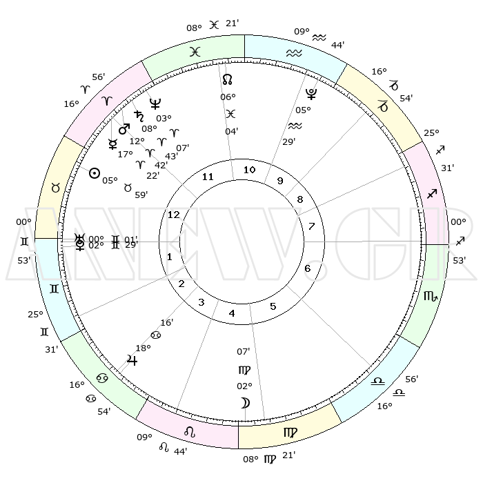 | | ΘΕΣΕΙΣ ΠΛΑΝΗΤΩΝ ΑΣΤΡΟΛΟΓΙΚΟΥ ΧΑΡΤΗ ΤΗΣ ΣΤΙΓΜΗΣ ΑΥΤΗΣ | | | | Πλανήτης | Ζώδιο | Μοίρες | Δεκαήμ. | Σε οίκο | Απόκλιση | | Ακμές των οίκων | | Ηλιος | Ταύρος | 05°56' | Πρώτο | 1 | 13 N 30 | | 1ος | 04°42' | Ταύρος | | Σελήνη | Παρθένος | 01°23' | Πρώτο | 5 | 11 N 28 | | 2ος | 05°38' | Δίδυμοι | | Ερμής | Κριός | 17°17' | Δεύτερο | 12 | 04 N 36 | | 3ος | 28°44' | Δίδυμοι | | Αφροδίτη | Δίδυμοι | 02°25' | Πρώτο | 1 | 21 N 18 | | 4ος | 20°27' | Καρκίνος | | Αρης | Κριός | 12°40' | Δεύτερο | 12 | 04 N 09 | | 5ος | 15°21' | Λέων | | Δίας | Καρκίνος | 18°16' | Δεύτερο | 3 | 22 N 34 | | 6ος | 18°59' | Παρθένος | | Κρόνος | Κριός | 08°42' | Πρώτο | 12 | 01 N 28 | | 7ος | 04°42' | Σκορπιός | | Ουρανός | Δίδυμοι | 00°01' | Πρώτο | 1 | 19 N 59 | | 8ος | 05°38' | Τοξότης | | Ποσειδώνας | Κριός | 03°06' | Πρώτο | 12 | 00 N 02 | | 9ος | 28°44' | Τοξότης | | Πλούτωνας | Υδροχόος | 05°29' | Πρώτο | 10 | 22 S 48 | | 10ος | 20°27' | Αιγόκερως | | Β. Δεσμός | Ιχθείς | 06°04' | Πρώτο | 11 | 09 S 17 | | 11ος | 15°21' | Υδροχόος | | Ωροσκόπος | Ταύρος | 04°42' | Πρώτο | | | 12ος | 18°59' | Ιχθείς | | Μεσουράνημα | Αιγόκερως | 20°27' | Τρίτο | | | |