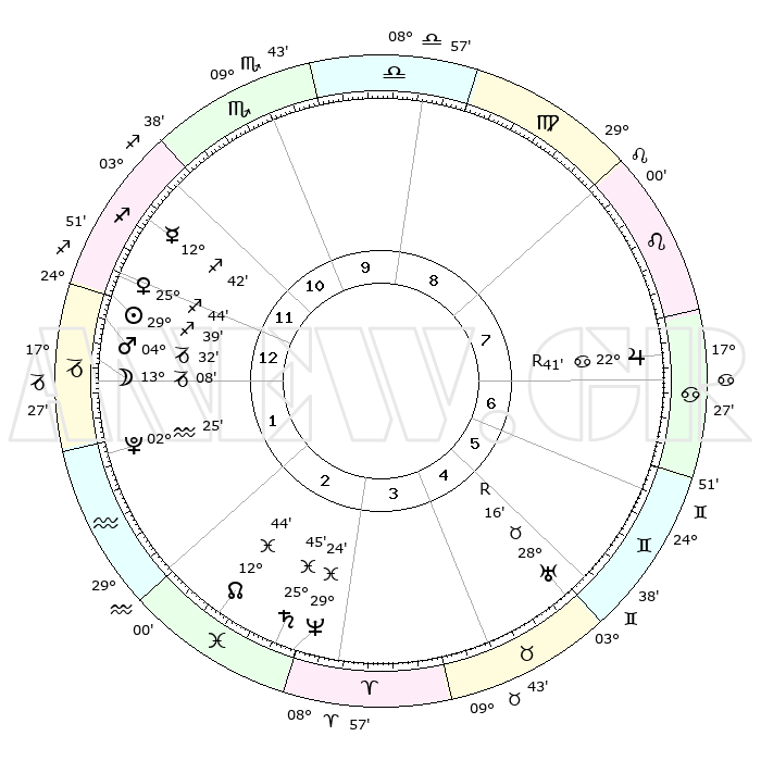 | | ΘΕΣΕΙΣ ΠΛΑΝΗΤΩΝ ΑΣΤΡΟΛΟΓΙΚΟΥ ΧΑΡΤΗ ΤΗΣ ΣΤΙΓΜΗΣ ΑΥΤΗΣ | | | | Πλανήτης | Ζώδιο | Μοίρες | Δεκαήμ. | Σε οίκο | Απόκλιση | | Ακμές των οίκων | | Ηλιος | Τοξότης | 29°26' | Τρίτο | 2 | 23 S 26 | | 1ος | 07°24' | Σκορπιός | | Σελήνη | Αιγόκερως | 10°24' | Δεύτερο | 3 | 27 S 25 | | 2ος | 06°17' | Τοξότης | | Ερμής | Τοξότης | 12°23' | Δεύτερο | 2 | 21 S 31 | | 3ος | 08°54' | Αιγόκερως | | Αφροδίτη | Τοξότης | 25°27' | Τρίτο | 2 | 23 S 26 | | 4ος | 13°38' | Υδροχόος | | Αρης | Αιγόκερως | 04°21' | Πρώτο | 2 | 24 S 11 | | 5ος | 16°23' | Ιχθείς | | Δίας | Καρκίνος | 22°42'R | Τρίτο | 9 | 21 N 44 | | 6ος | 14°19' | Κριός | | Κρόνος | Ιχθείς | 25°45' | Τρίτο | 5 | 03 S 48 | | 7ος | 07°24' | Ταύρος | | Ουρανός | Ταύρος | 28°17'R | Τρίτο | 7 | 19 N 35 | | 8ος | 06°17' | Δίδυμοι | | Ποσειδώνας | Ιχθείς | 29°24' | Τρίτο | 5 | 01 S 28 | | 9ος | 08°54' | Καρκίνος | | Πλούτωνας | Υδροχόος | 02°24' | Πρώτο | 3 | 23 S 17 | | 10ος | 13°38' | Λέων | | Β. Δεσμός | Ιχθείς | 12°45' | Δεύτερο | 4 | 06 S 46 | | 11ος | 16°23' | Παρθένος | | Ωροσκόπος | Σκορπιός | 07°24' | Πρώτο | | | 12ος | 14°19' | Ζυγός | | Μεσουράνημα | Λέων | 13°38' | Δεύτερο | | | |