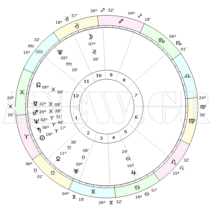 | | ΘΕΣΕΙΣ ΠΛΑΝΗΤΩΝ ΑΣΤΡΟΛΟΓΙΚΟΥ ΧΑΡΤΗ ΤΗΣ ΣΤΙΓΜΗΣ ΑΥΤΗΣ | | | | Πλανήτης | Ζώδιο | Μοίρες | Δεκαήμ. | Σε οίκο | Απόκλιση | | Ακμές των οίκων | | Ηλιος | Κριός | 19°13' | Δεύτερο | 2 | 07 N 31 | | 1ος | 17°04' | Υδροχόος | | Σελήνη | Αιγόκερως | 06°37' | Πρώτο | 11 | 27 S 48 | | 2ος | 02°50' | Κριός | | Ερμής | Ιχθείς | 22°03' | Τρίτο | 1 | 05 S 14 | | 3ος | 08°08' | Ταύρος | | Αφροδίτη | Ταύρος | 11°33' | Δεύτερο | 3 | 15 N 12 | | 4ος | 04°01' | Δίδυμοι | | Αρης | Ιχθείς | 29°25' | Τρίτο | 1 | 01 S 10 | | 5ος | 25°55' | Δίδυμοι | | Δίας | Καρκίνος | 16°24' | Δεύτερο | 5 | 22 N 48 | | 6ος | 18°18' | Καρκίνος | | Κρόνος | Κριός | 06°40' | Πρώτο | 2 | 00 N 41 | | 7ος | 17°04' | Λέων | | Ουρανός | Ταύρος | 29°08' | Τρίτο | 3 | 19 N 48 | | 8ος | 02°50' | Ζυγός | | Ποσειδώνας | Κριός | 02°31' | Πρώτο | 1 | 00 S 12 | | 9ος | 08°08' | Σκορπιός | | Πλούτωνας | Υδροχόος | 05°20' | Πρώτο | 12 | 22 S 47 | | 10ος | 04°01' | Τοξότης | | Β. Δεσμός | Ιχθείς | 06°59' | Πρώτο | 1 | 08 S 57 | | 11ος | 25°55' | Τοξότης | | Ωροσκόπος | Υδροχόος | 17°04' | Δεύτερο | | | 12ος | 18°18' | Αιγόκερως | | Μεσουράνημα | Τοξότης | 04°01' | Πρώτο | | | |
