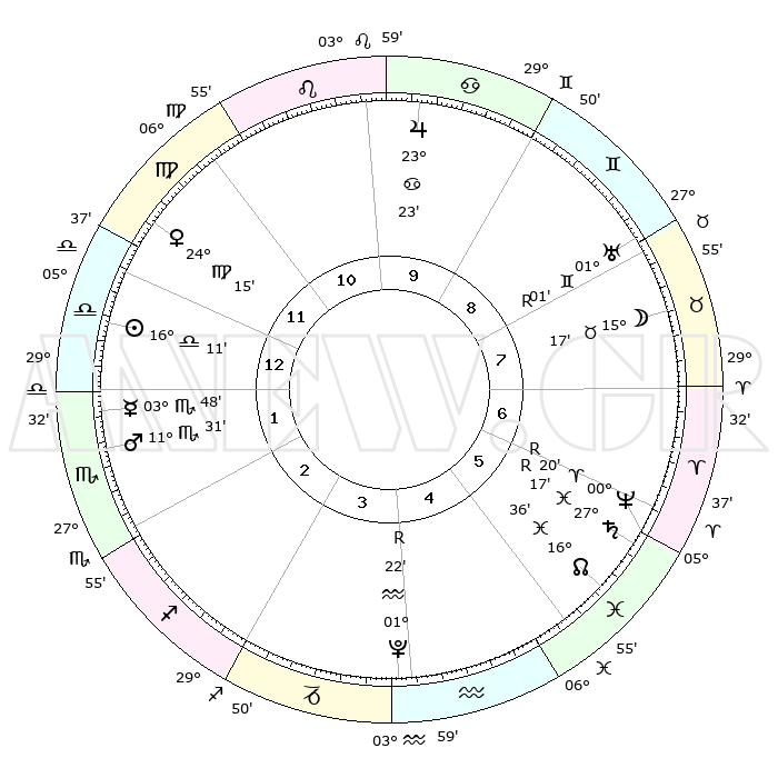 | ΘΕΣΕΙΣ ΠΛΑΝΗΤΩΝ ΑΣΤΡΟΛΟΓΙΚΟΥ ΧΑΡΤΗ ΤΗΣ ΣΤΙΓΜΗΣ ΑΥΤΗΣ | | Πλανήτης | Ζώδιο | Μοίρες | Δεκαήμ. | Σε οίκο | Απόκλιση | | Ακμές των οίκων | Ηλιος | Ζυγός | 16°05' | Δεύτερο | 1 | 06 S 19 | | 1ος | 26°54' | Παρθένος | Σελήνη | Ταύρος | 13°36' | Δεύτερο | 8 | 20 N 01 | | 2ος | 23°15' | Ζυγός | Ερμής | Σκορπιός | 03°38' | Πρώτο | 2 | 13 S 44 | | 3ος | 23°34' | Σκορπιός | Αφροδίτη | Παρθένος | 24°06' | Τρίτο | 12 | 03 N 40 | | 4ος | 26°31' | Τοξότης | Αρης | Σκορπιός | 11°26' | Δεύτερο | 2 | 15 S 25 | | 5ος | 29°32' | Αιγόκερως | Δίας | Καρκίνος | 23°23' | Τρίτο | 10 | 21 N 27 | | 6ος | 00°05' | Ιχθείς | Κρόνος | Ιχθείς | 27°17'R | Τρίτο | 7 | 03 S 23 | | 7ος | 26°54' | Ιχθείς | Ουρανός | Δίδυμοι | 01°01'R | Πρώτο | 9 | 20 N 09 | | 8ος | 23°15' | Κριός | Ποσειδώνας | Κριός | 00°20'R | Πρώτο | 7 | 01 S 08 | | 9ος | 23°34' | Ταύρος | Πλούτωνας | Υδροχόος | 01°22'R | Πρώτο | 5 | 23 S 32 | | 10ος | 26°31' | Δίδυμοι | Β. Δεσμός | Ιχθείς | 16°37' | Δεύτερο | 6 | 05 S 17 | | 11ος | 29°32' | Καρκίνος | Ωροσκόπος | Παρθένος | 26°54' | Τρίτο | | | 12ος | 00°05' | Παρθένος | Μεσουράνημα | Δίδυμοι | 26°31' | Τρίτο | | | |